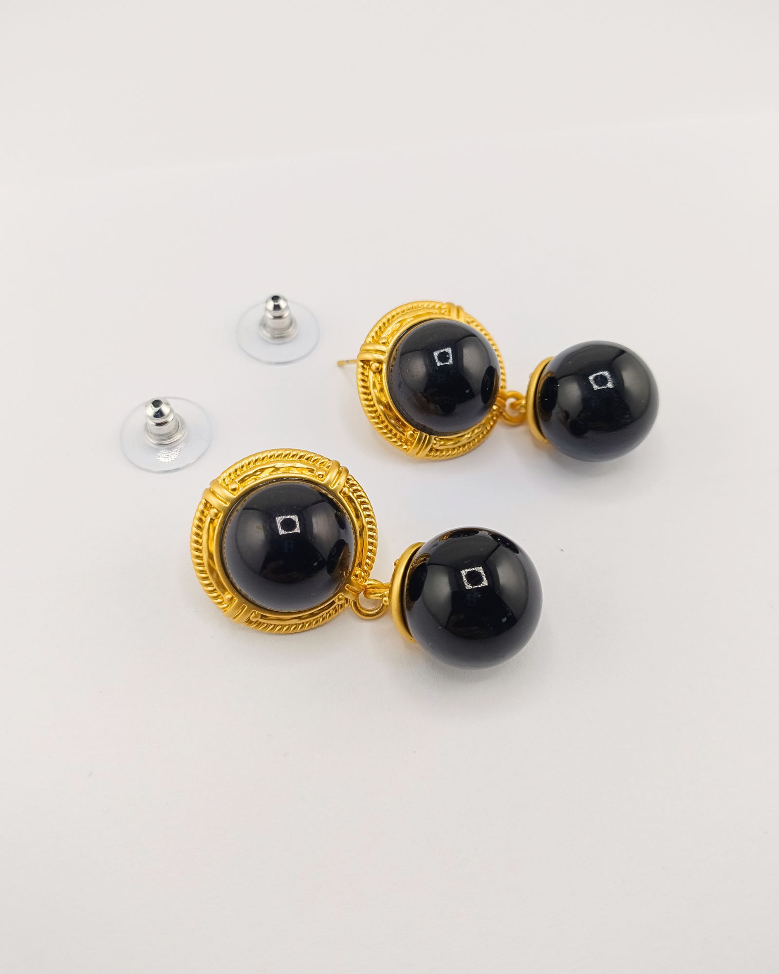 Channel timeless elegance with a modern edge in the Izoa Selah Vintage Drop Earrings. Crafted from 18k gold plating, these vintage-inspired earrings feature a classic stud top and a bold black ball drop, offering the perfect blend of retro glamour and contemporary chic.