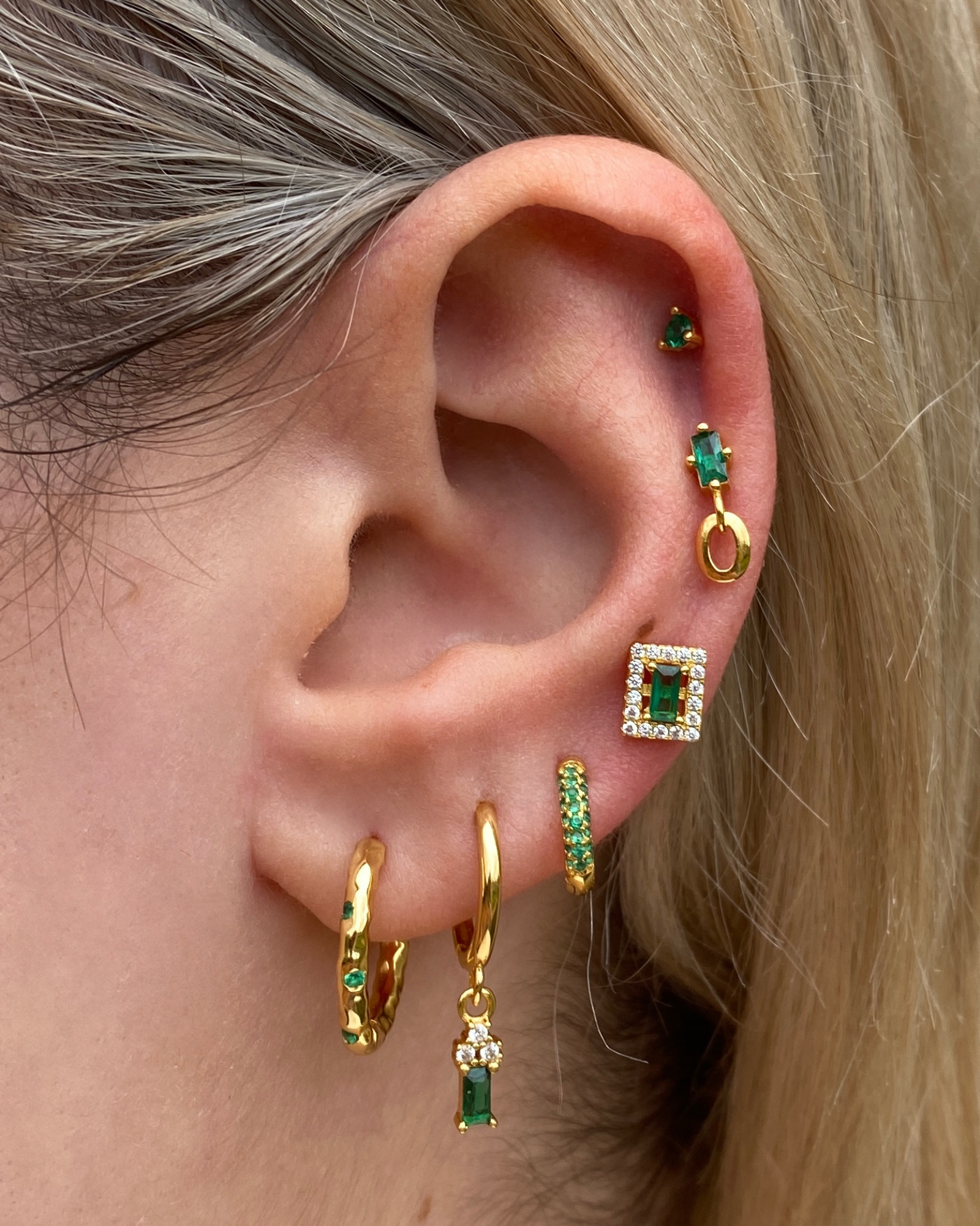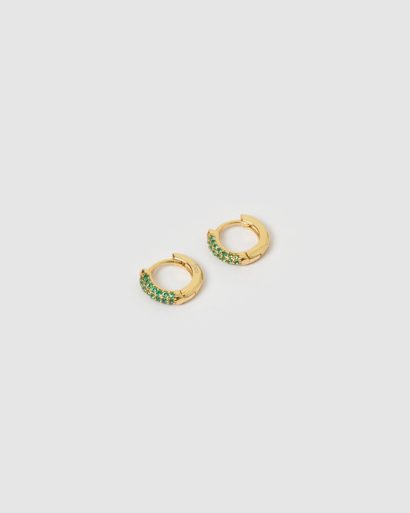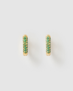 Shop huggie style earrings online at Izoa. Our Kaylee Huggie Earrings in Gold Green are petite style fit embellished in cubic zirconias. These earrings can be worn everyday and paired with similar style huggies for a layered textural look. A simple way to sparkle up your look.