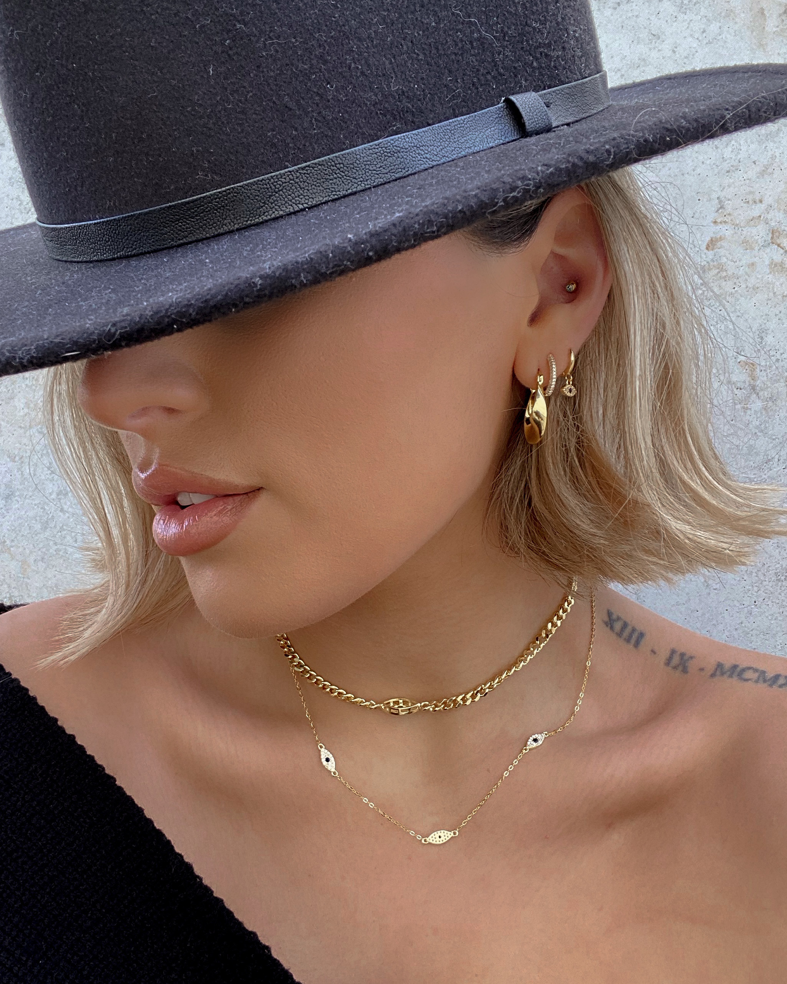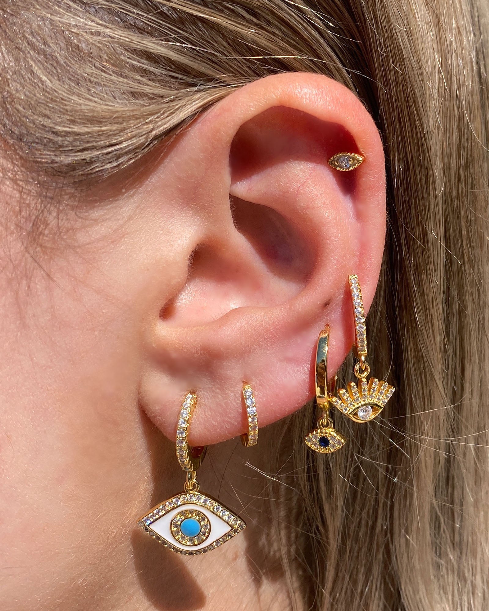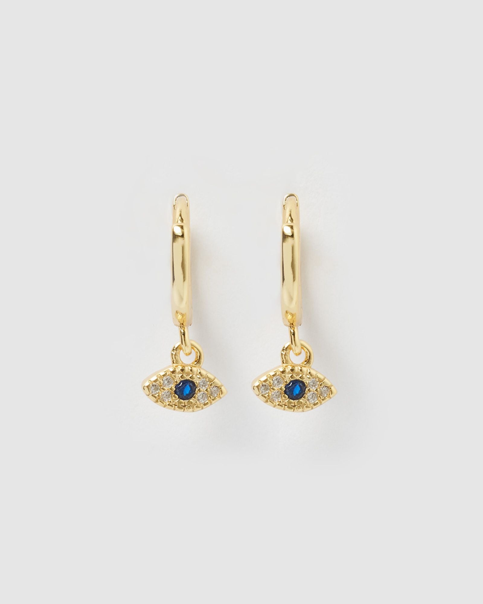 Shop petite style earrings online at Izoa. Our Ophelia Huggie Earrings in Gold are a petite style fit. Eye motif following on Egyptian trends and beliefs to ward off evil sprits. A great style to be worn daily.