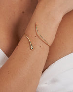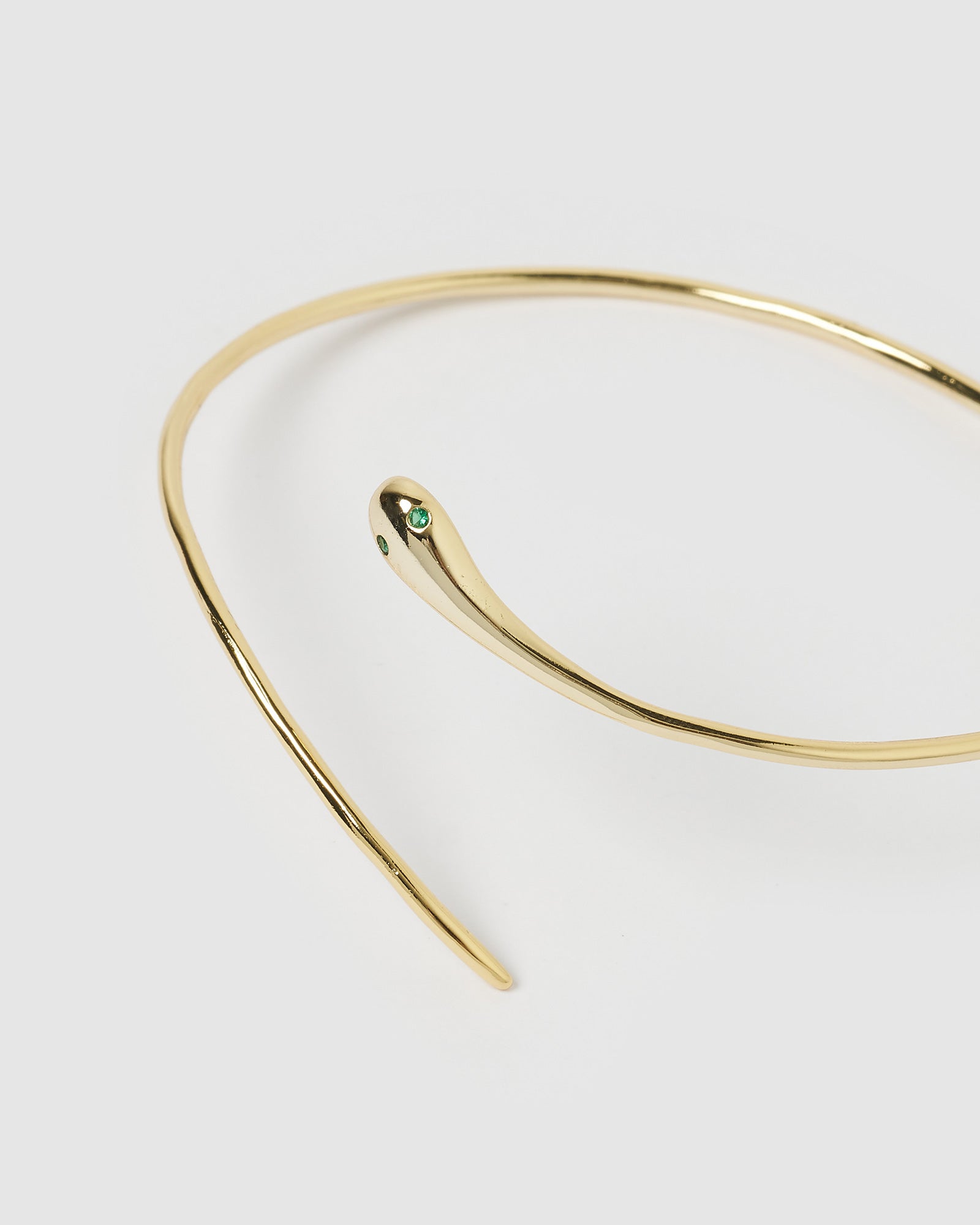 Shop our Serpent Green Eye Cuff Gold wraps beautifully around the wrist for a minimalistic elegant look. This brass 18k gold plated cuff with an emerald green cubic zirconia eye creates a subtle statement for your everyday or evening accessory.