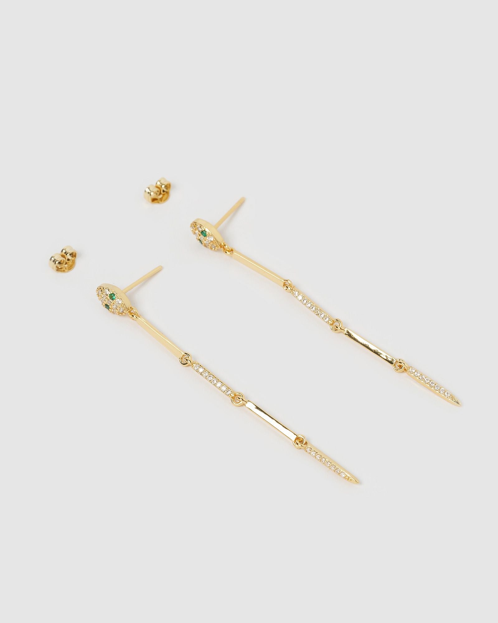 The Pia Snake Head Stud Earrings in Gold are a must have. These 18k gold plated with emerald green eye cubic zirconia and clear crystal snake stud drop earrings will be sure to brighten up any outfit.