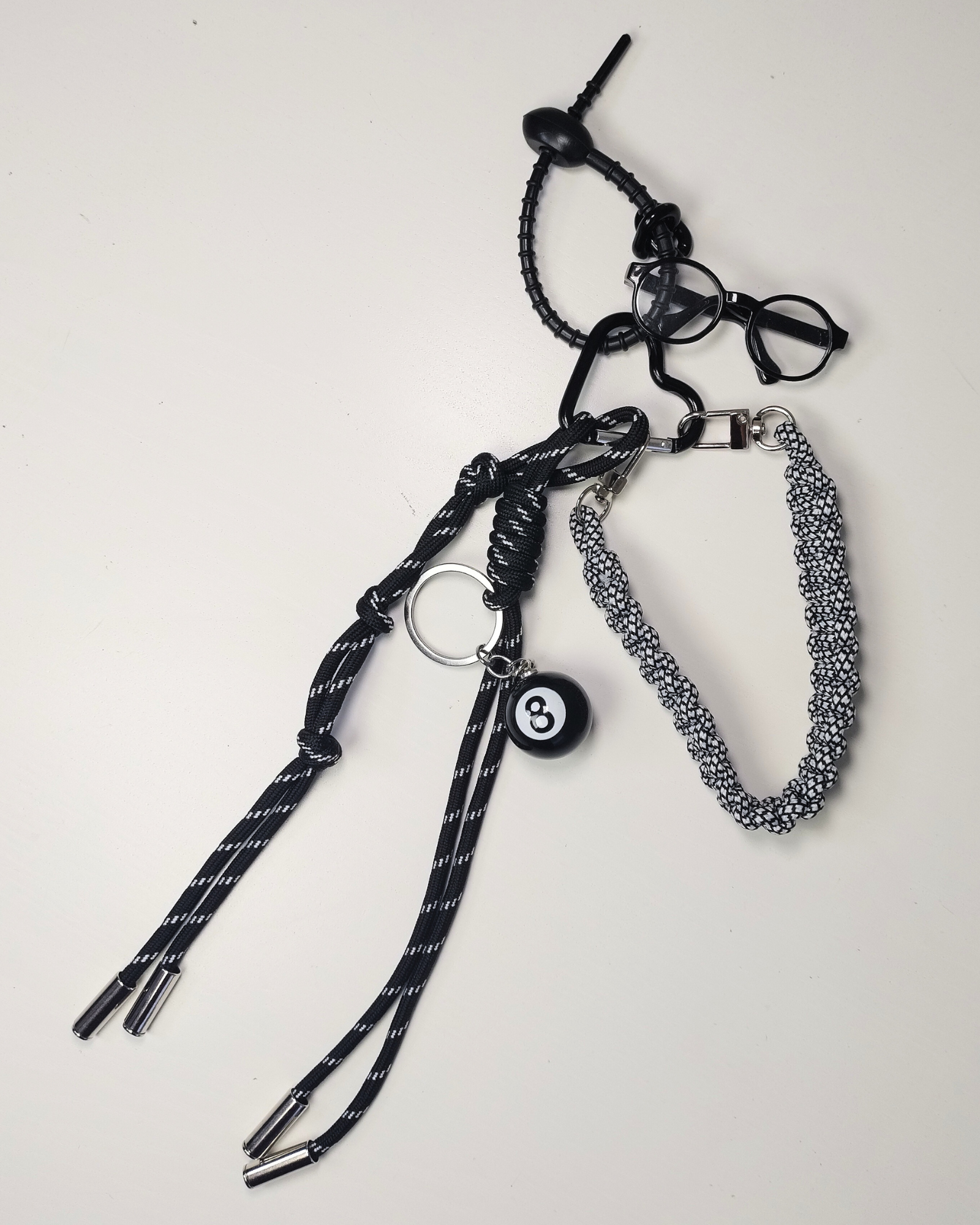 Add a pop of fun to your bag accessories with our 8 Ball Bag Charm! This playful charm features a 8 Ball, eyeglasses, black rope tie charms and a navy rope threaded charm. Perfect for adding personality to your handbag, keys, or backpack, this must-have charm is a statement piece for any accessory lover. Shop now and give your everyday look a cute and colourful upgrade!