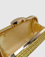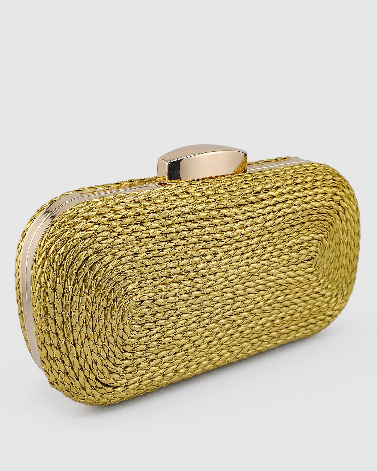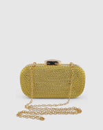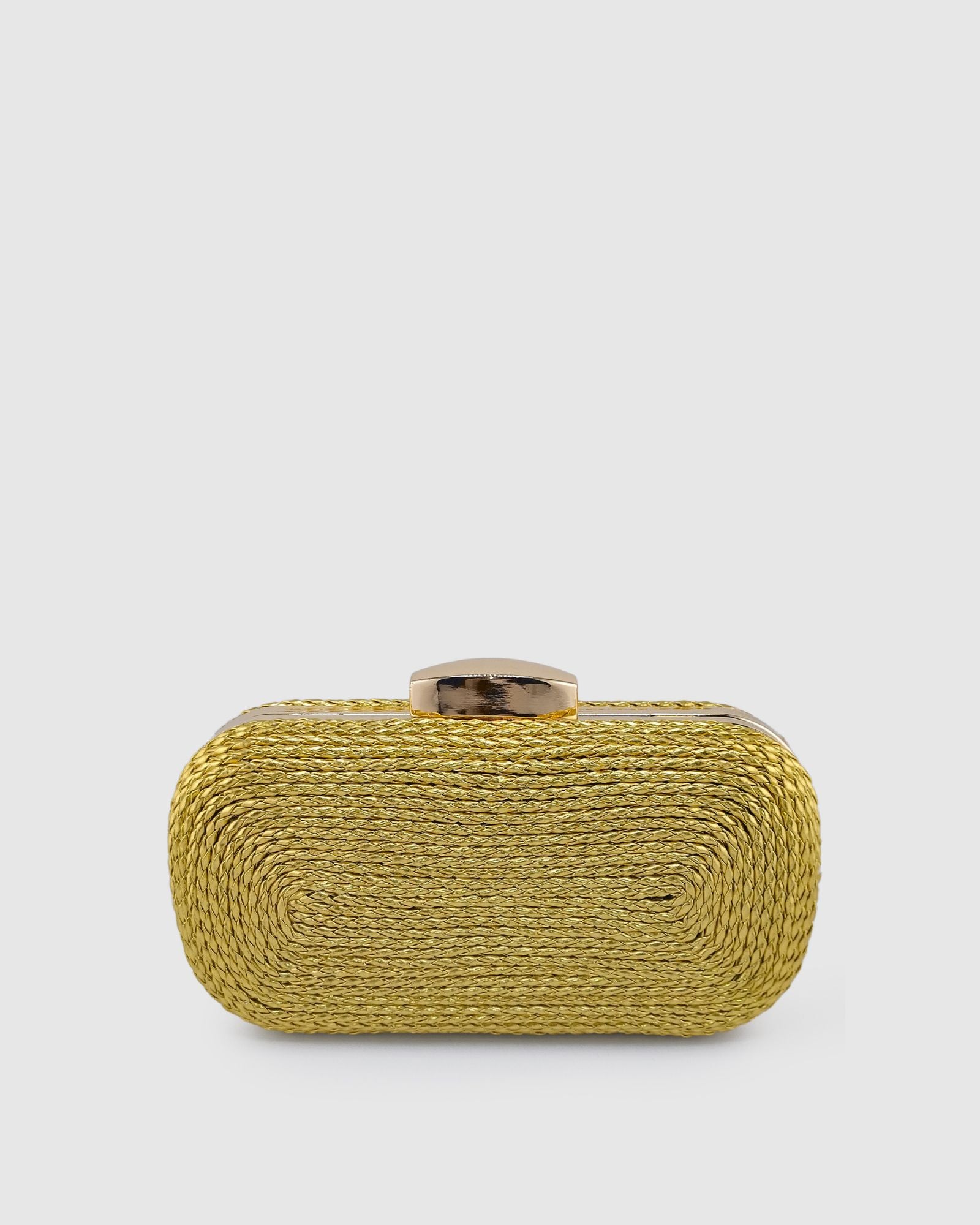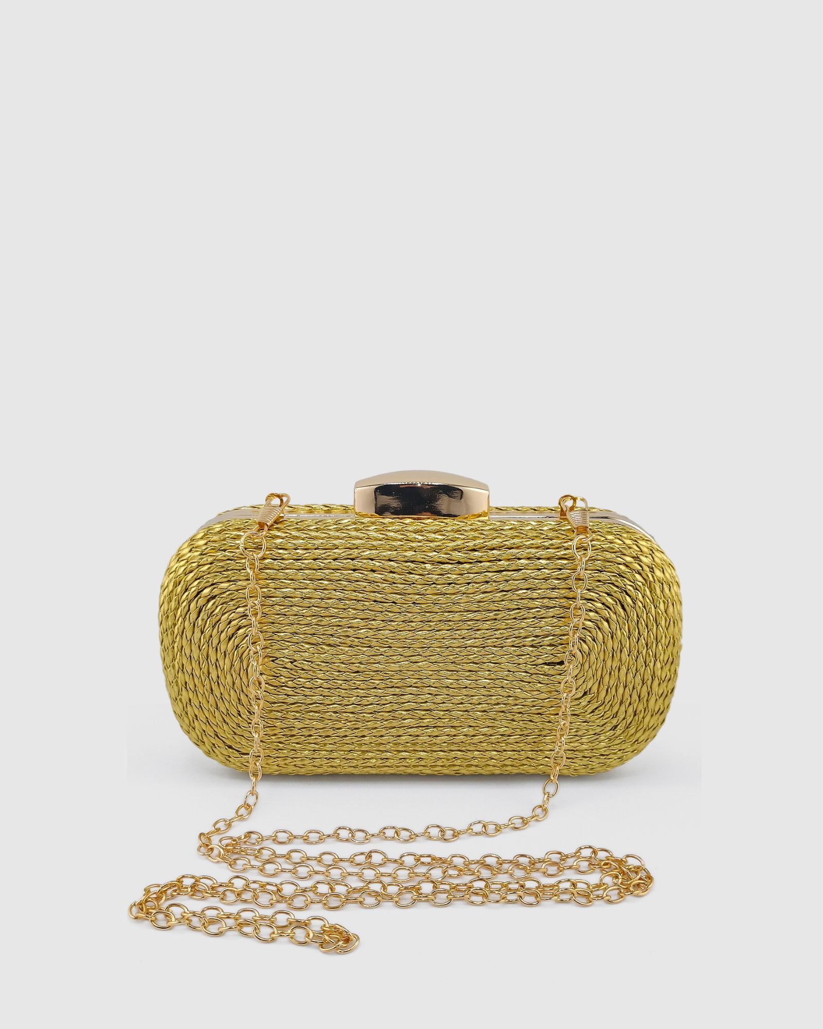 Make a shimmering statement with the Helen Rope Detail Clutch in Gold, a sophisticated blend of intricate design and modern glam. This stunning clutch features a high-quality small rope wrap detail that sets it apart from traditional evening bags, adding a unique, tactile element that catches both light and attention. Finished with a matching gold clasp and hardware, and complete with both a shoulder chain and a longer crossbody chain, this versatile piece is made to turn headsâfrom cocktail parties to weddings.