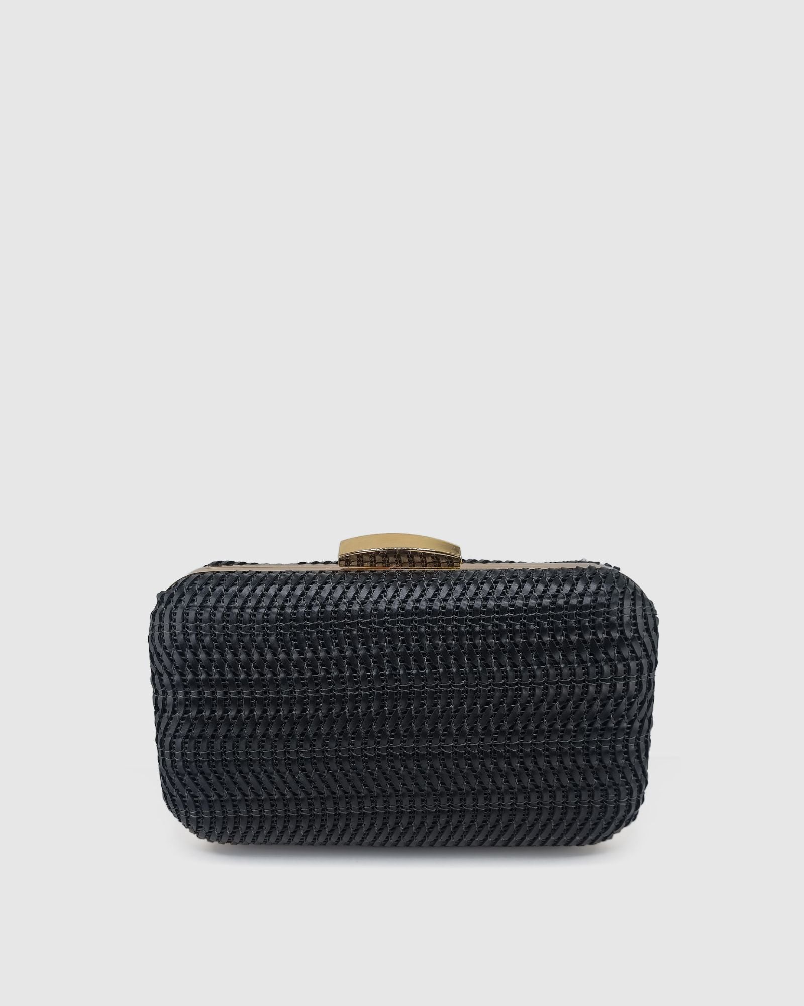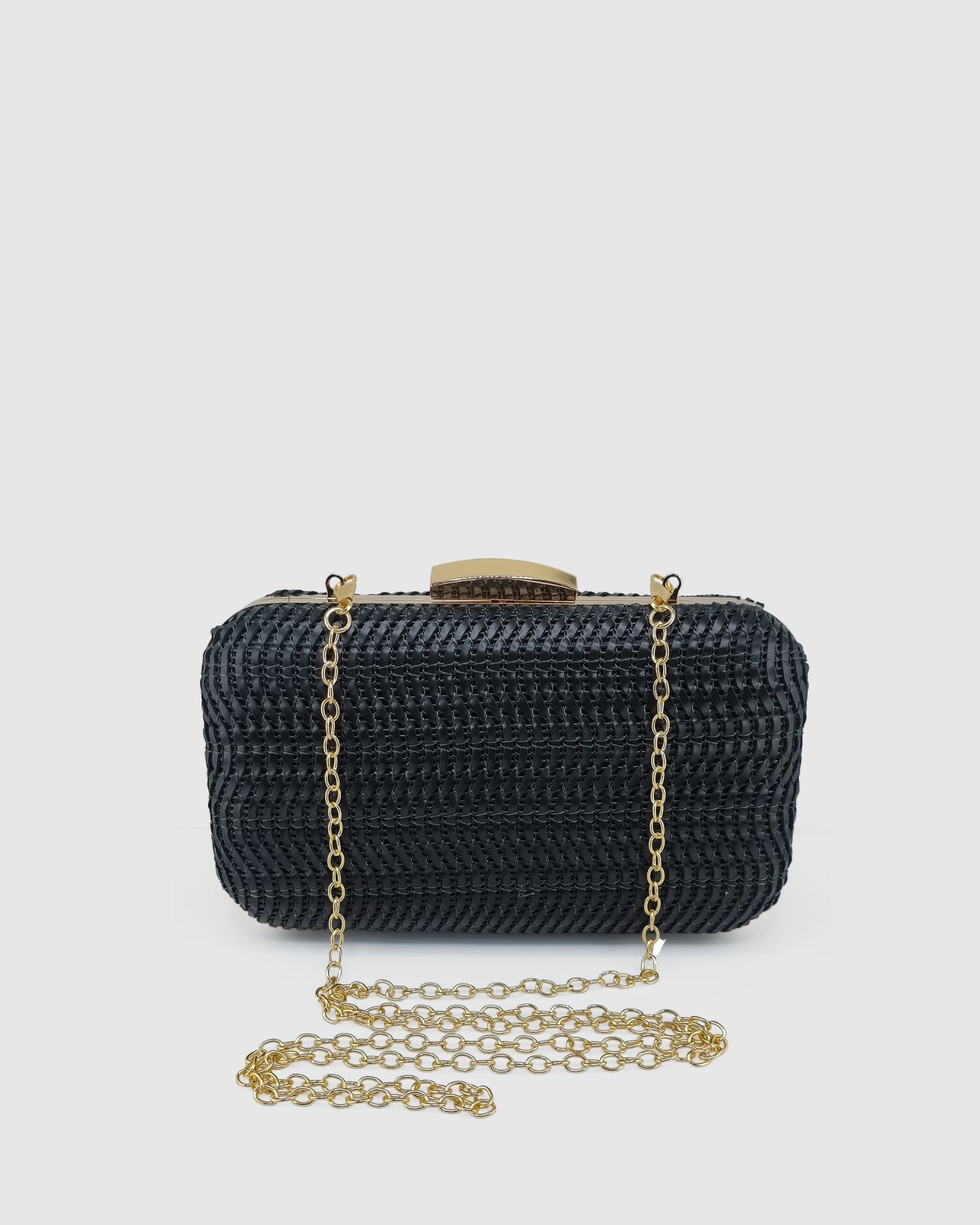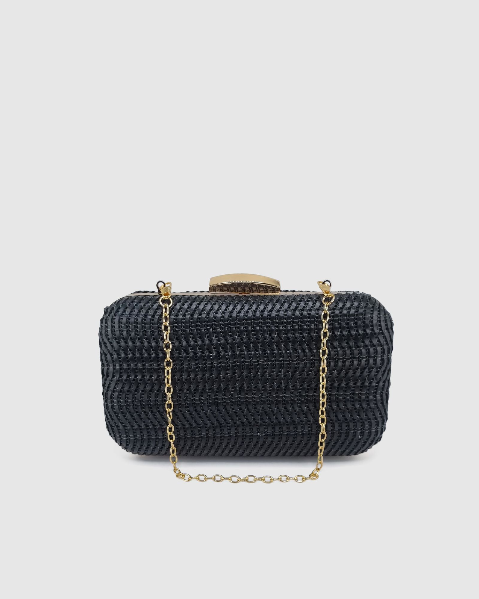 Add depth, texture, and timeless style to your wardrobe with the Sophia Woven Clutch in Black. Featuring a distinctive high-quality woven finish, this elegant piece combines artisanal detail with modern structure. Accented with a luxurious gold clasp and equipped with both a shoulder chain and a longer crossbody chain, the Sophia Clutch is designed to transition effortlessly from formal events to stylish daytime outings.
