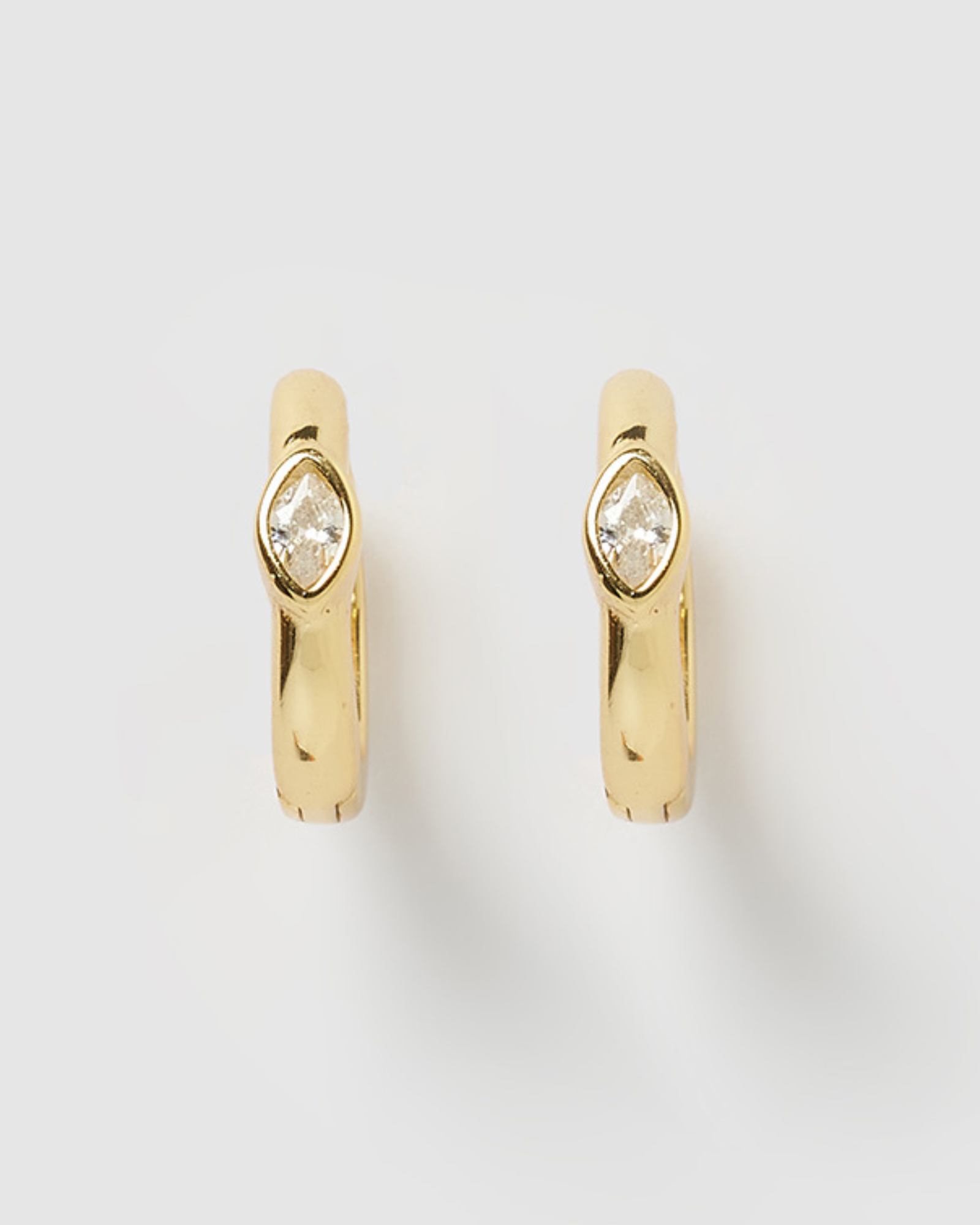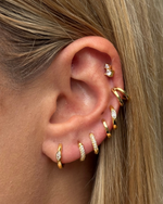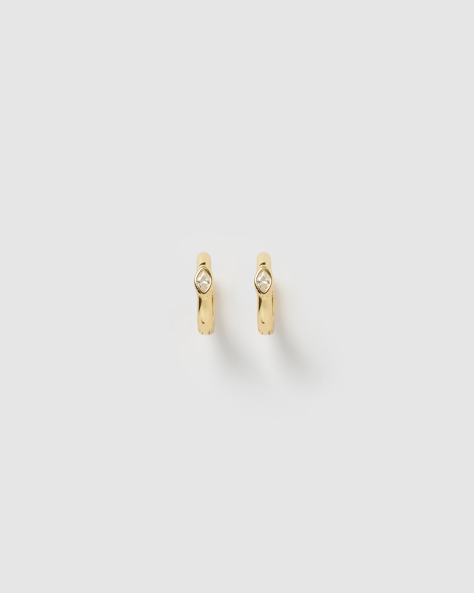 Shop huggie style earrings online at Izoa. Our Capri Huggie Earrings in Gold Clear are petite style fit. These smooth finished earrings featuring a single cubic zirconia at the front can be worn everyday and paired with similar style huggies for a layered textural look.