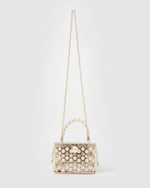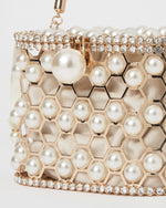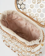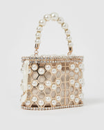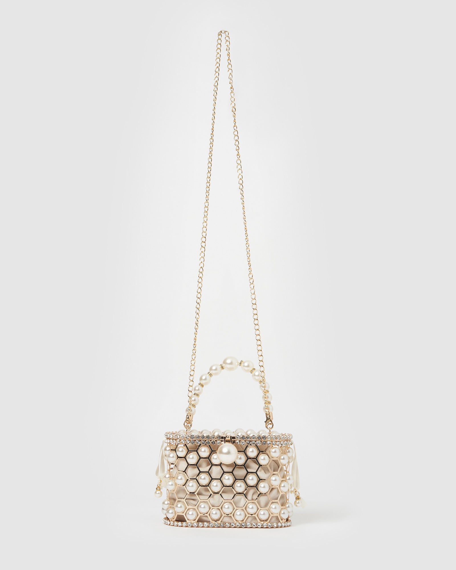 The Izoa Harper Pearl Bag is the perfect accessory for any outfit. Its white pearl exterior is adorned with gold detailing and beautiful gemstone features, creating an elegant and stylish look. Carry it to your next event to make a statement.