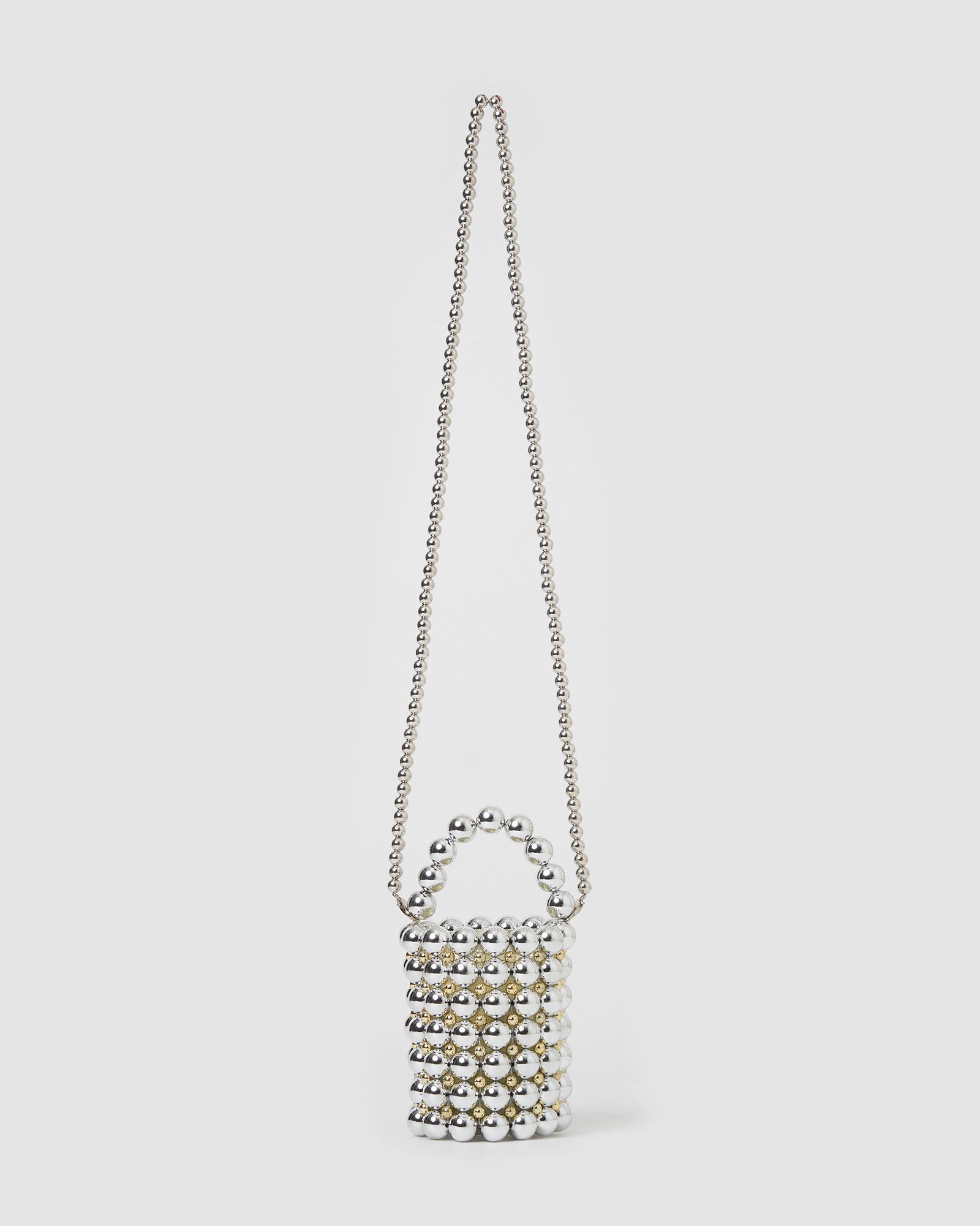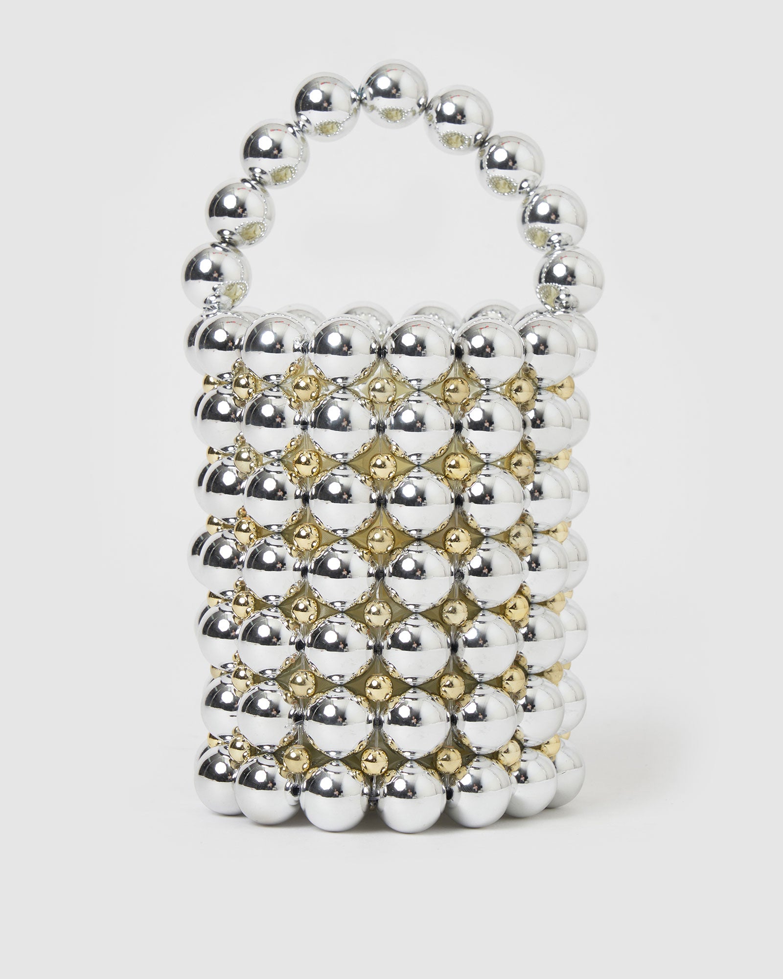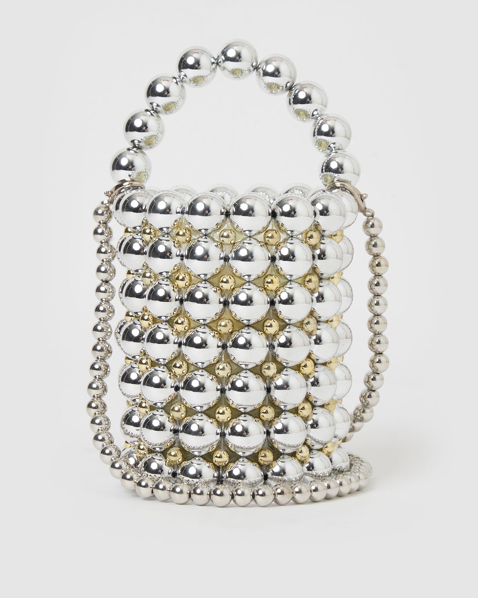 Match the Besito Pearl Handbag in Silver with your super cute fashion-forward look. Featuring large silver and gold coloured faux pearls throughout. The structure is solid formed in a bucket shape and the inner pouch made of a shimmery satin in champagne pink.