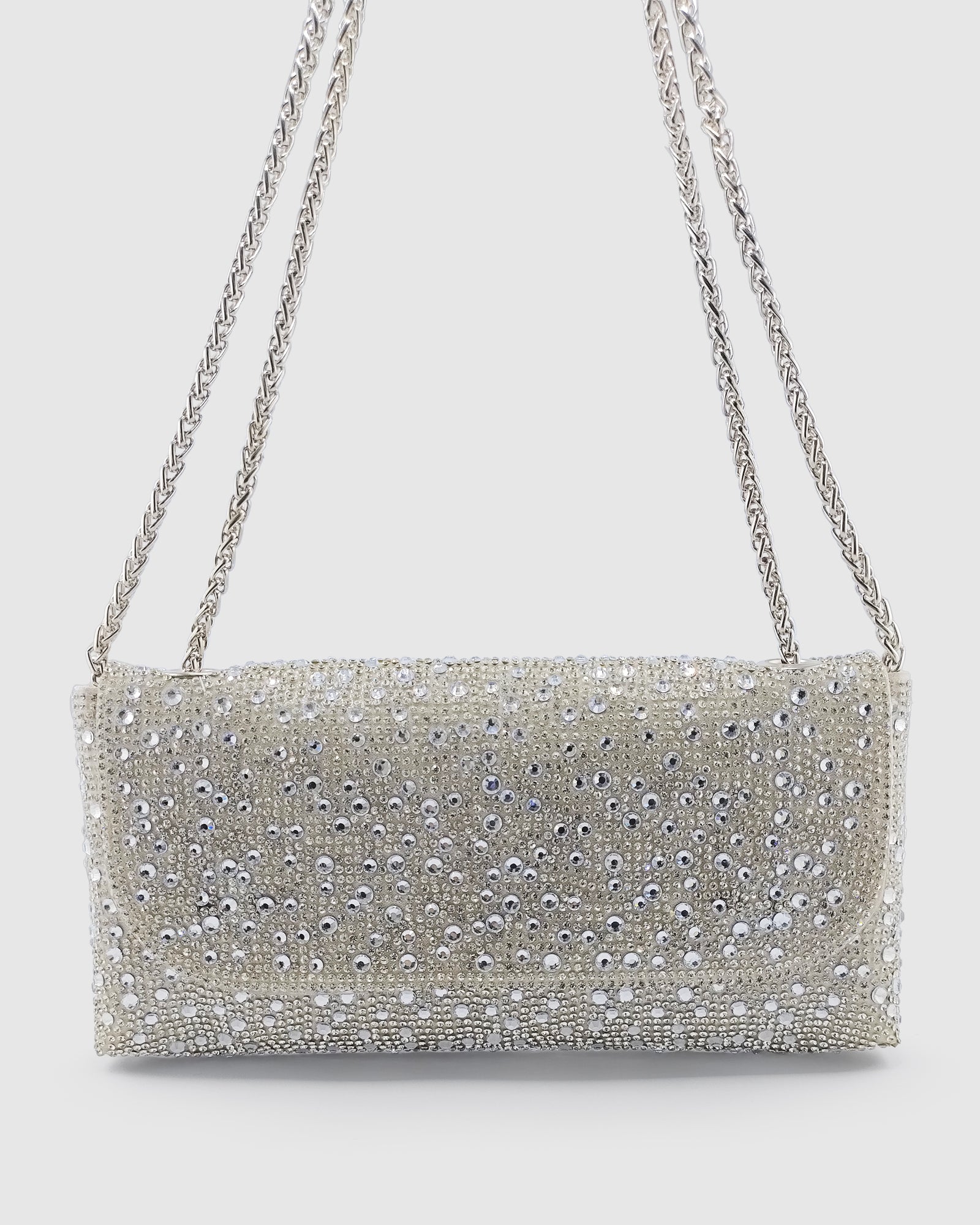 Elevate your evening look with the Elani Clutch in Silver Crystal – a modern statement piece designed to shimmer through every occasion. This sleek clutch features a foldover flap with secure magnetic closures, adding both function and style. The adjustable silver chain strap offers versatile wear – carry it as a chic shoulder bag or a hands-free crossbody. Embellished with sparkling black crystals, the Elani is the perfect companion for weddings, formal events, or a night out.