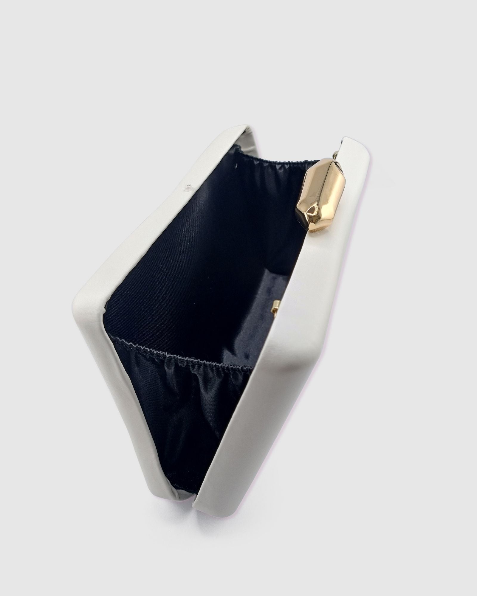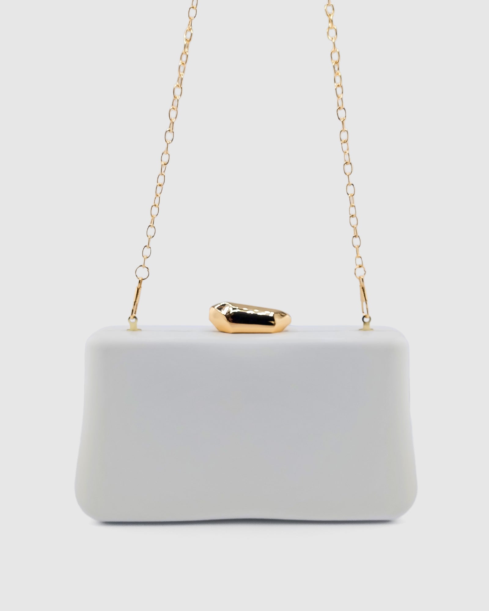 Effortlessly chic with a modern twist, the Izzy Clutch in White is the perfect accessory to elevate your occasion-wear. Designed in a soft, rounded rectangle shape, this clutch features a standout wave-style gold top clasp, adding a sculptural, fashion-forward touch. The spacious interior easily fits your iPhone and daily essentials, while the long gold chain strap offers versatile crossbody styling. Ideal for bridal looks, events, or a night out, the Izzy adds elegance with an edge.