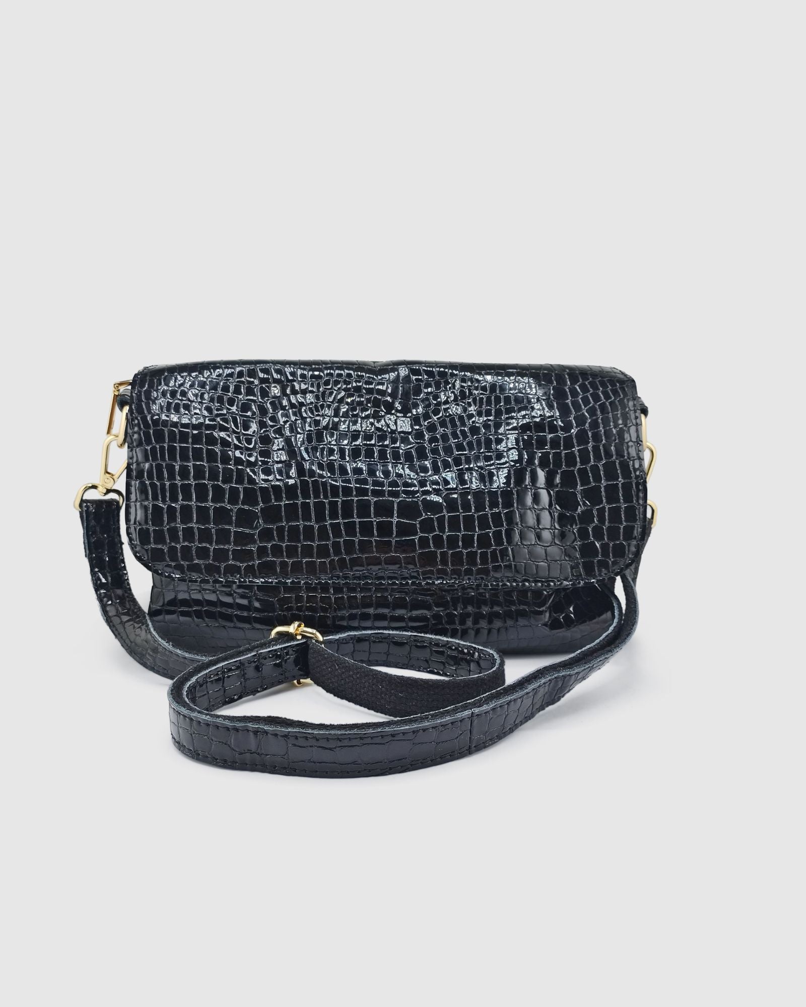 - Smooth black patent leather for a sleek, modern look