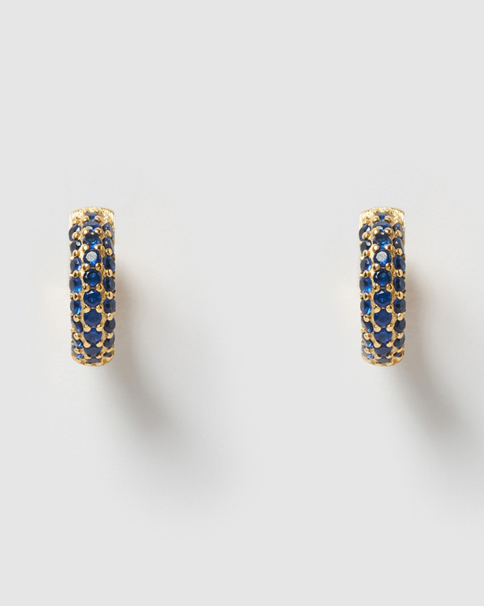 Simple and elegant are the Chelsea Mini Huggie Earrings in Gold Blue. Sparkling blue cubic zirconia half set in these petite sterling silver 18k gold plated hoops are designed to hug your ear. Perfect piece for layering or own its own.