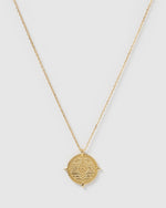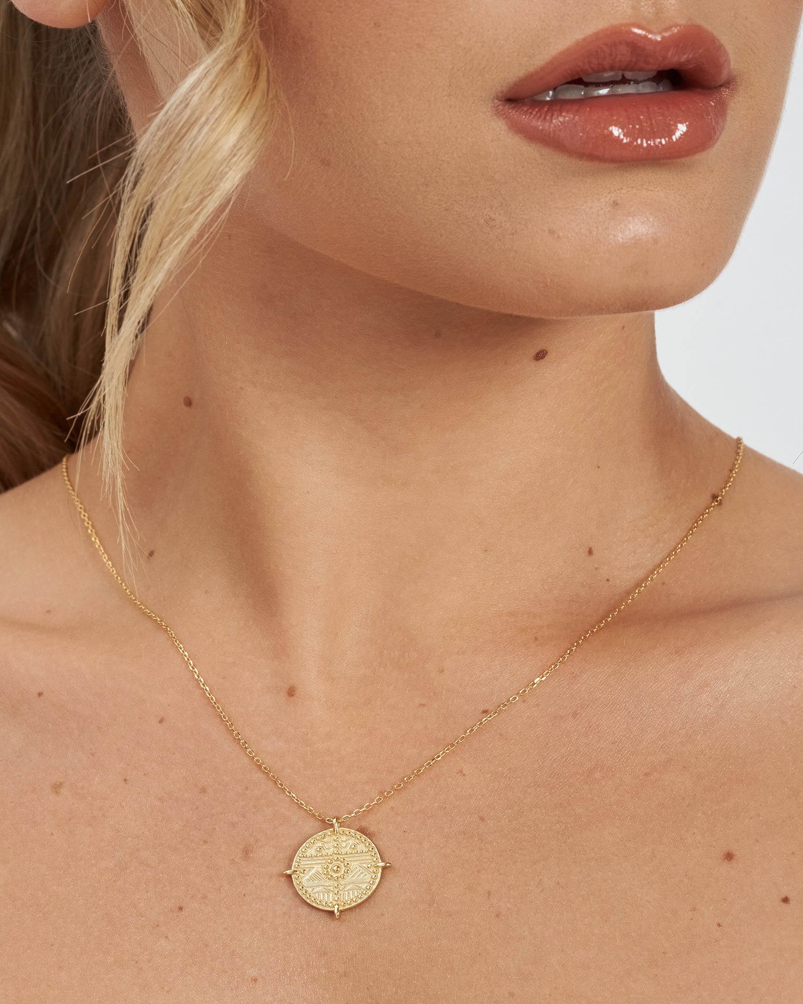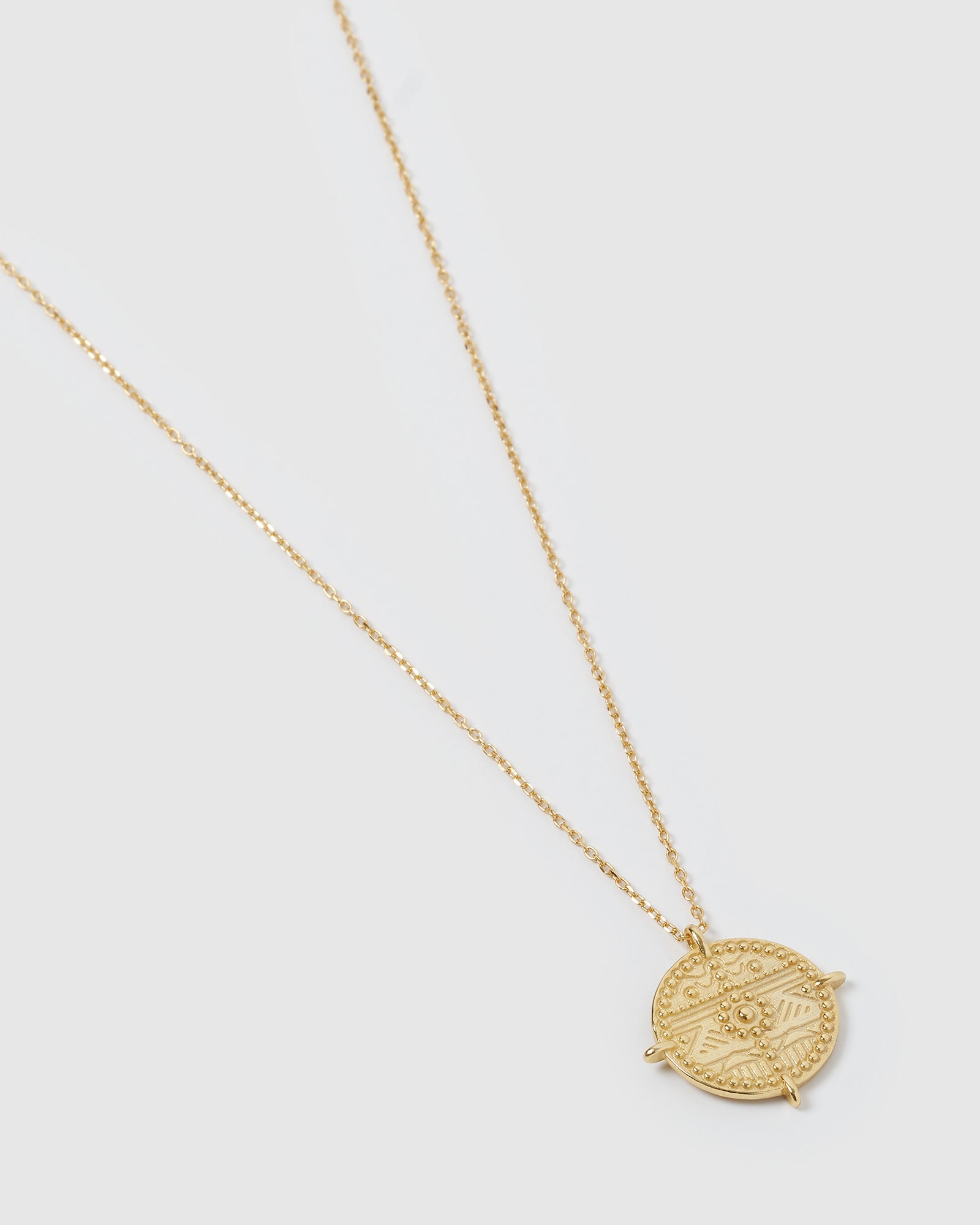 Shop the Izoa Ancient City Coin Necklace in Gold. This 18k gold coin pendant necklace is embossed and inspired by the ancient city. A great layering piece or ideal to keep it simple and dainty.