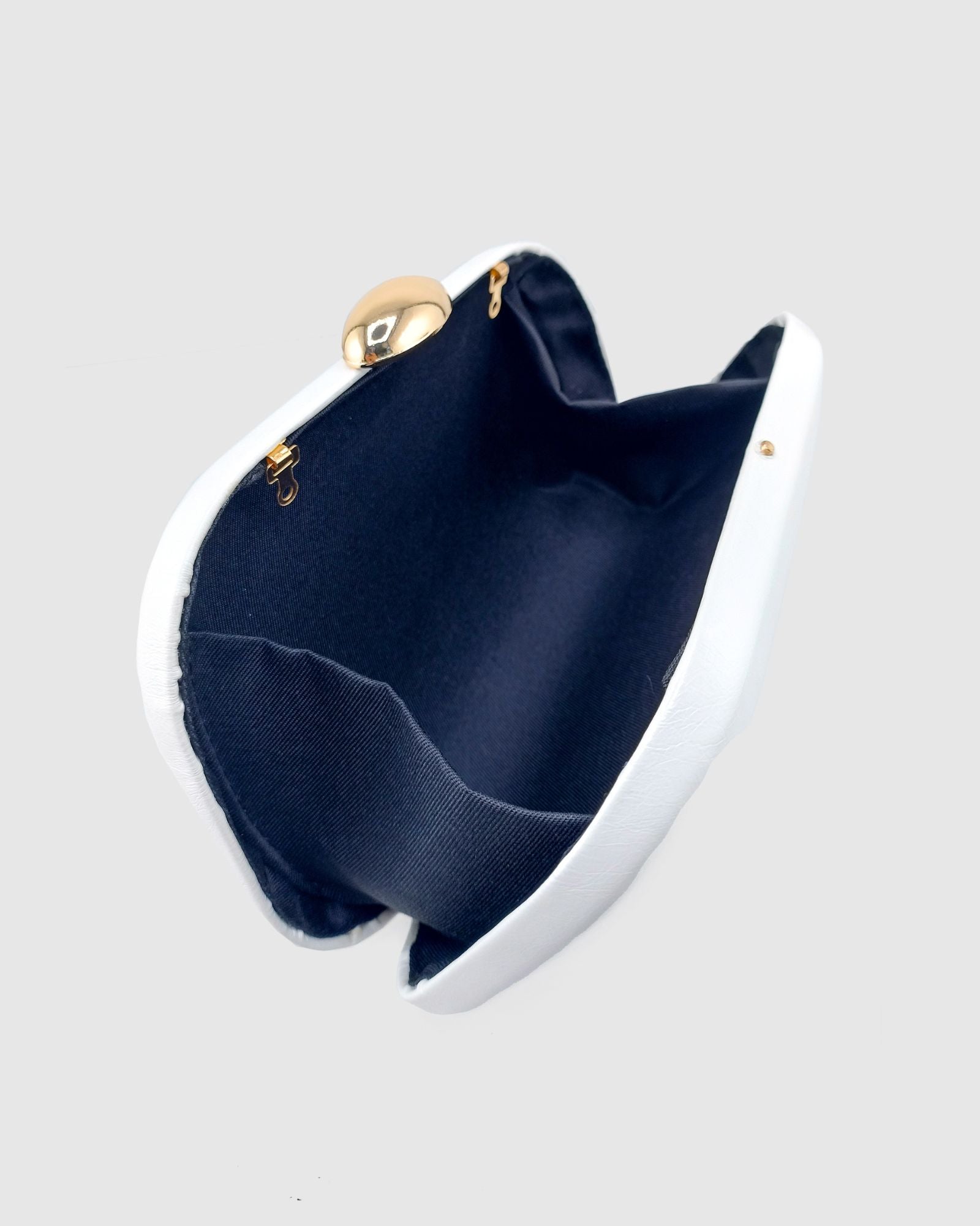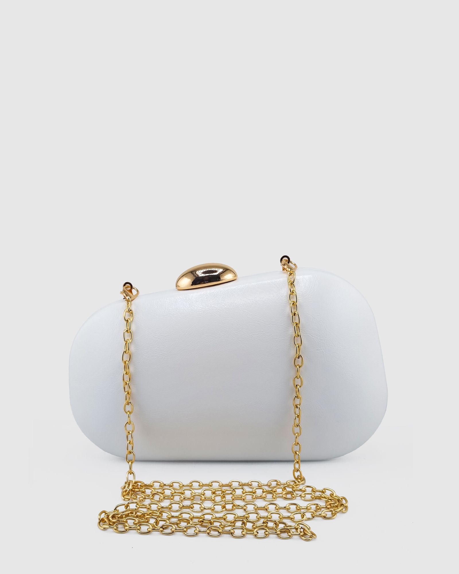 Effortlessly chic with a modern twist, the Daisy Clutch in White is the perfect accessory to elevate your occasion-wear. Designed in a soft, rounded rectangle shape, this pu leather clutch features a standout round gold top clasp, adding a sculptural, fashion-forward touch. The spacious interior easily fits your iPhone and daily essentials, while the long gold chain strap offers versatile crossbody styling. Ideal for bridal looks, events, or a night out, the Izzy adds elegance with an edge.