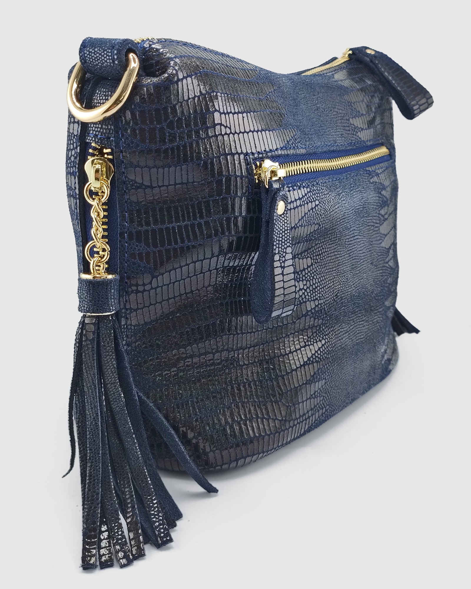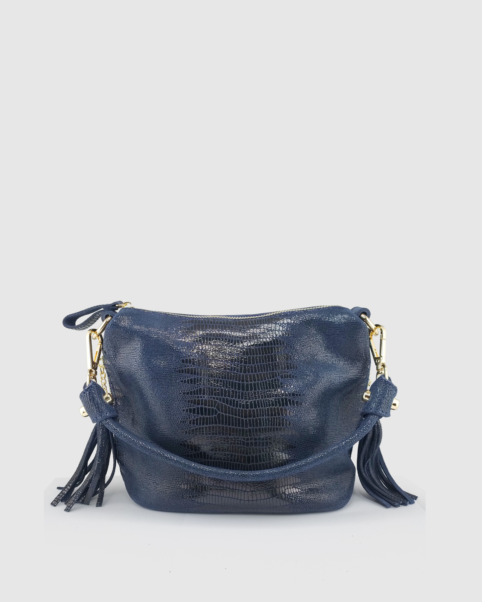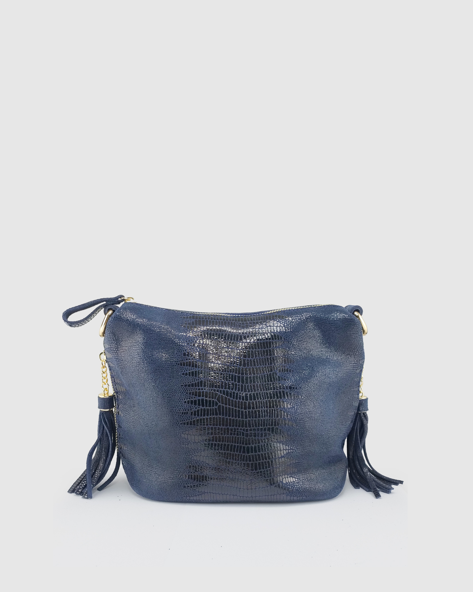 Add a touch of effortless elegance to your everyday style with the Nicole Tassel Bag. Crafted from stunning navy leather, this beautifully designed bag features two playful tassels on either side, offering a chic and contemporary finish.