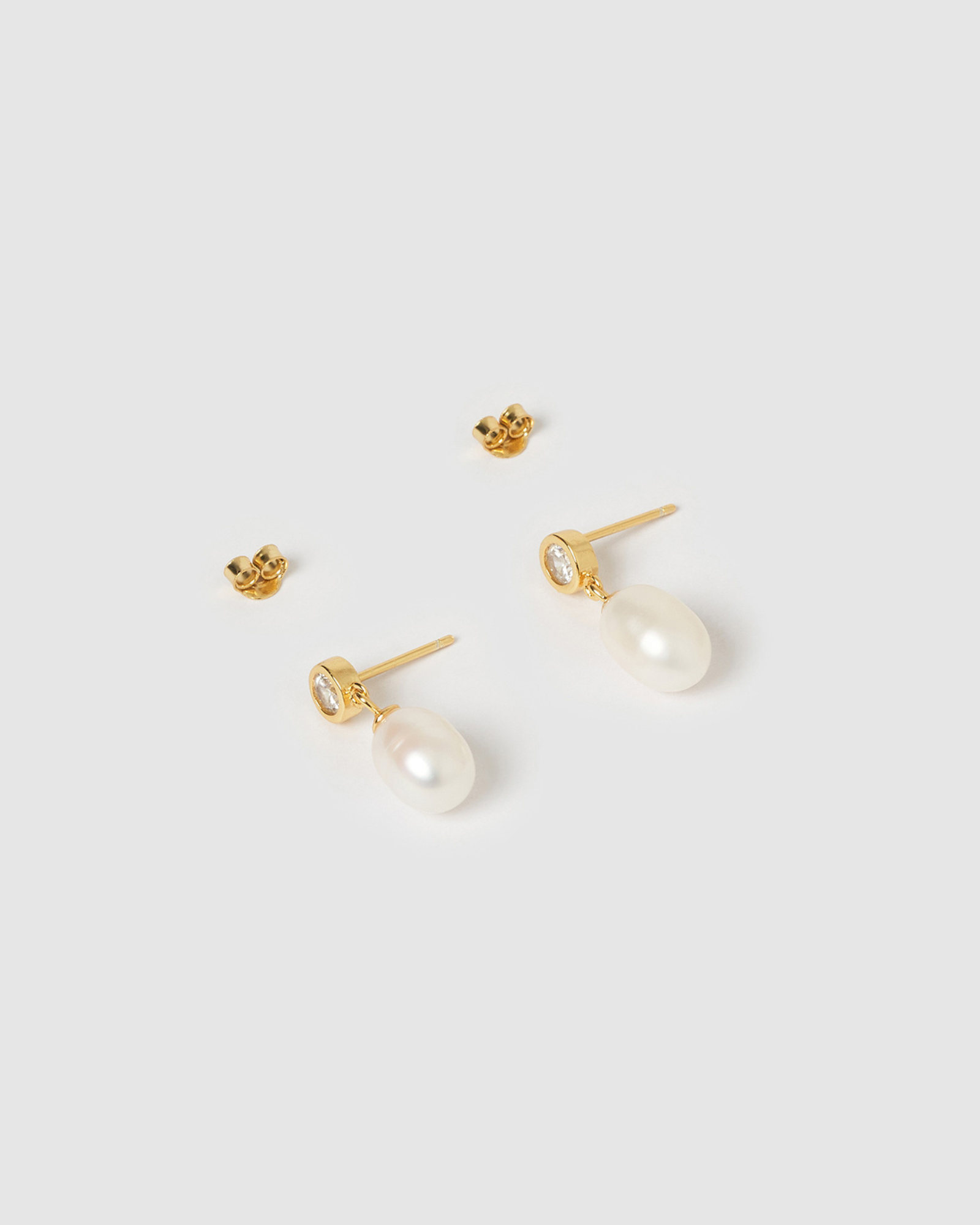 Fall in love with the Izoa Everlee Earrings Gold Pearl. These drop studs with a faux pearl featuring a small gem are the type of earrings you can wear all the time. From simple day outfits, to stylish night looks these earrings will become a staple.