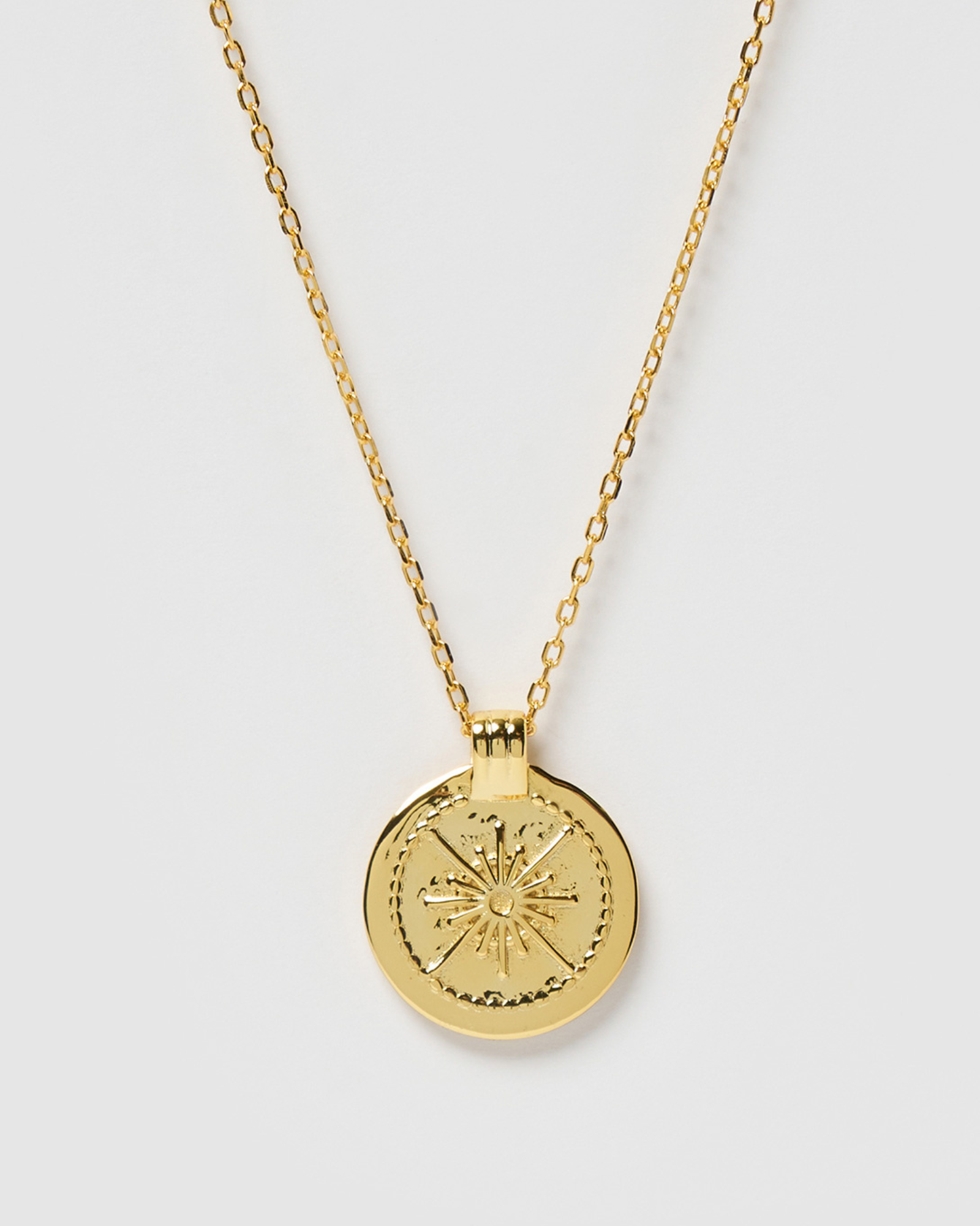 The Izoa Octavius Necklace Gold is a piece to always keep close. With an embossed medallion, this sterling silver, 18k gold plated necklace is a simple and elegant piece.
