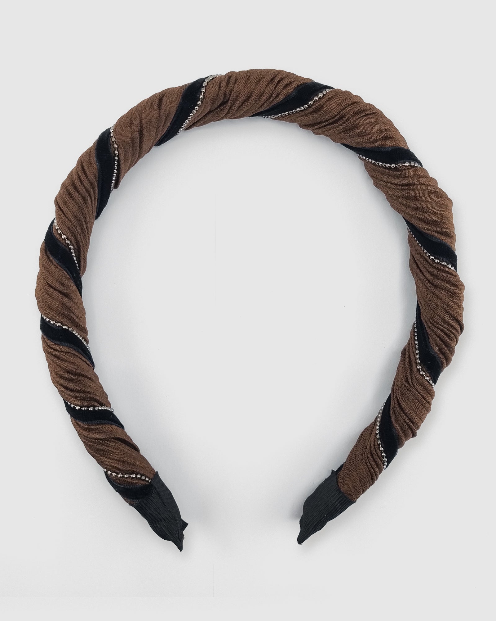 Elevate your hair accessories game with the Meeka Headband – where bold meets beautiful. This eye-catching brown headband features a stylish twisted fabric design with sleek black stripes, adding texture and contrast to your look. Delicately embellished with rows of sparkling crystals, the Meeka offers the perfect mix of everyday chic and statement sparkle. Whether you're dressing up a casual outfit or finishing off an evening look, this headband brings effortless glamour and standout style. A must-have piece for any accessories lover.