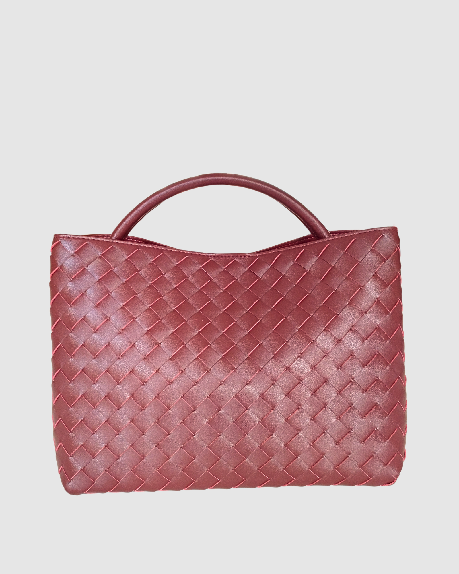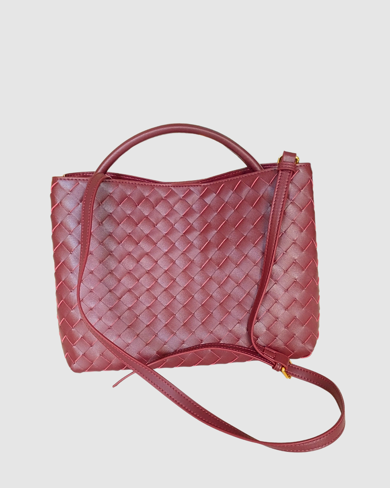 The Izoa Lauren Woven Tote Bag in Burgundy combines sophisticated style with practical functionality. This versatile leather handbag showcases an intricate woven construction that adds texture and visual interest to any outfit.