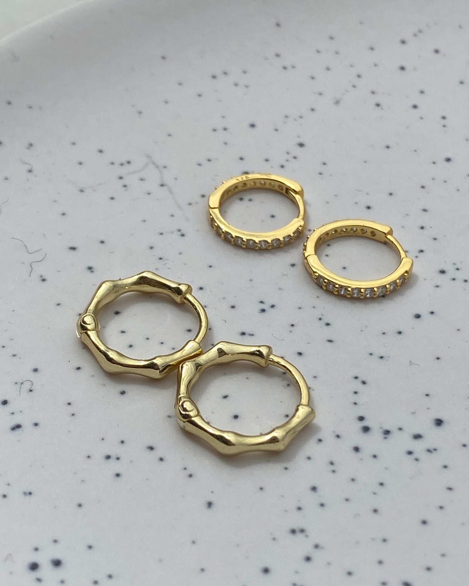 Collect our new Gold Huggies Bundle! Our new bundle includes the delicate Remi Huggies paired with our unique Sculpt Huggies in Gold. Perfect for an earring stack, get your gold stack started with our Gold Huggies Bundle!