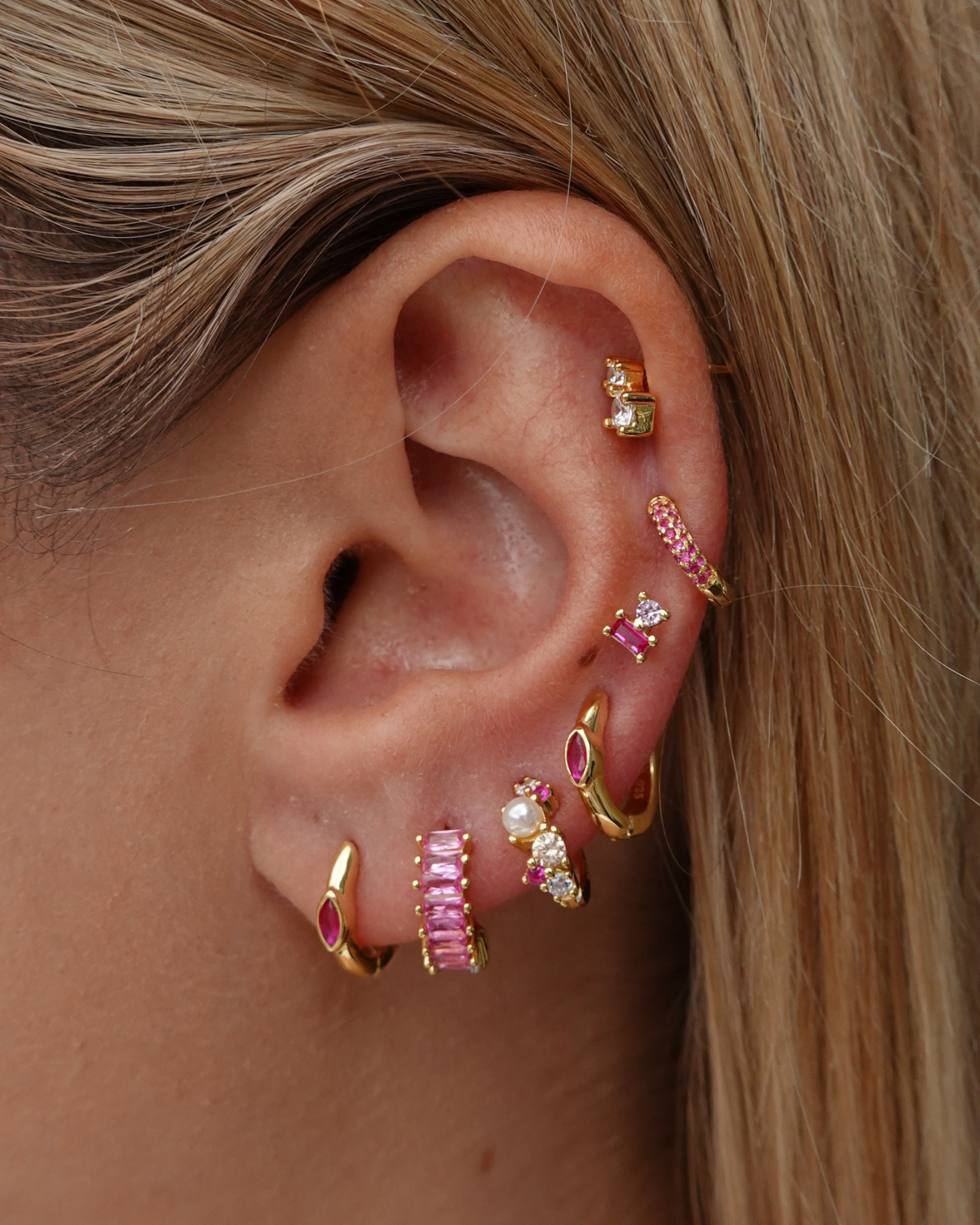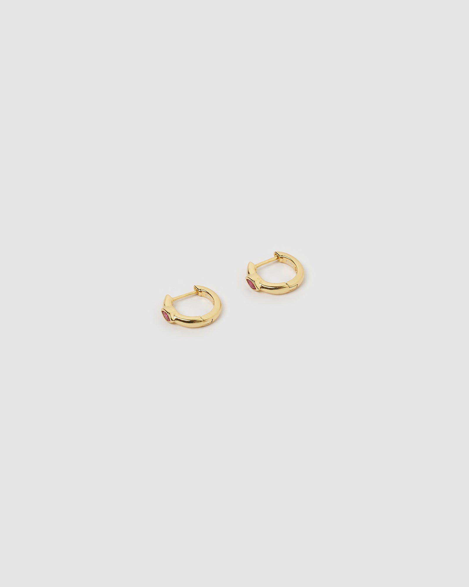 Shop huggie style earrings online at Izoa. Our Capri Huggie Earrings in Gold Pink are petite style fit. These smooth finished earrings featuring a single cubic zirconia at the front can be worn everyday and paired with similar style huggies for a layered textural look.