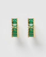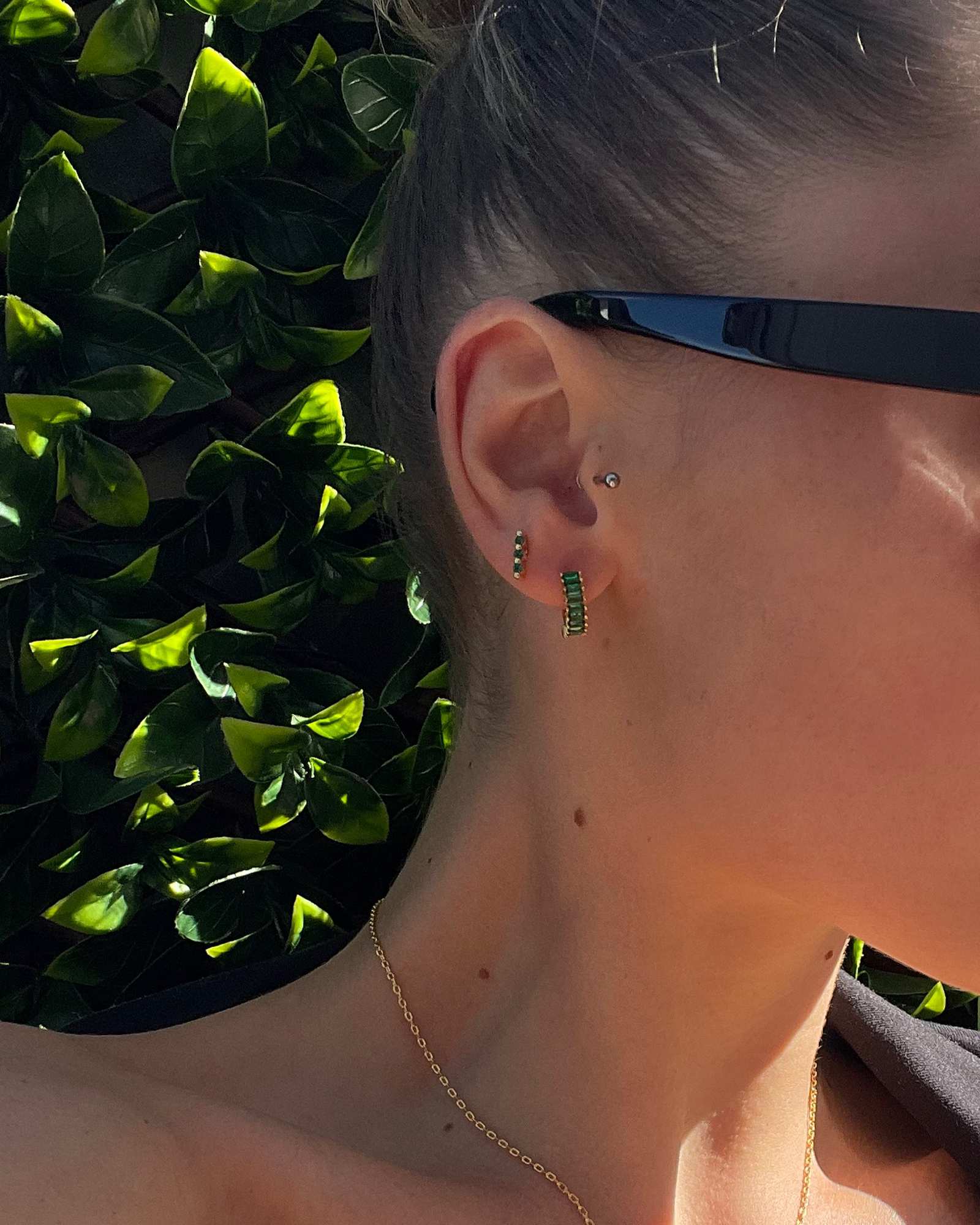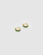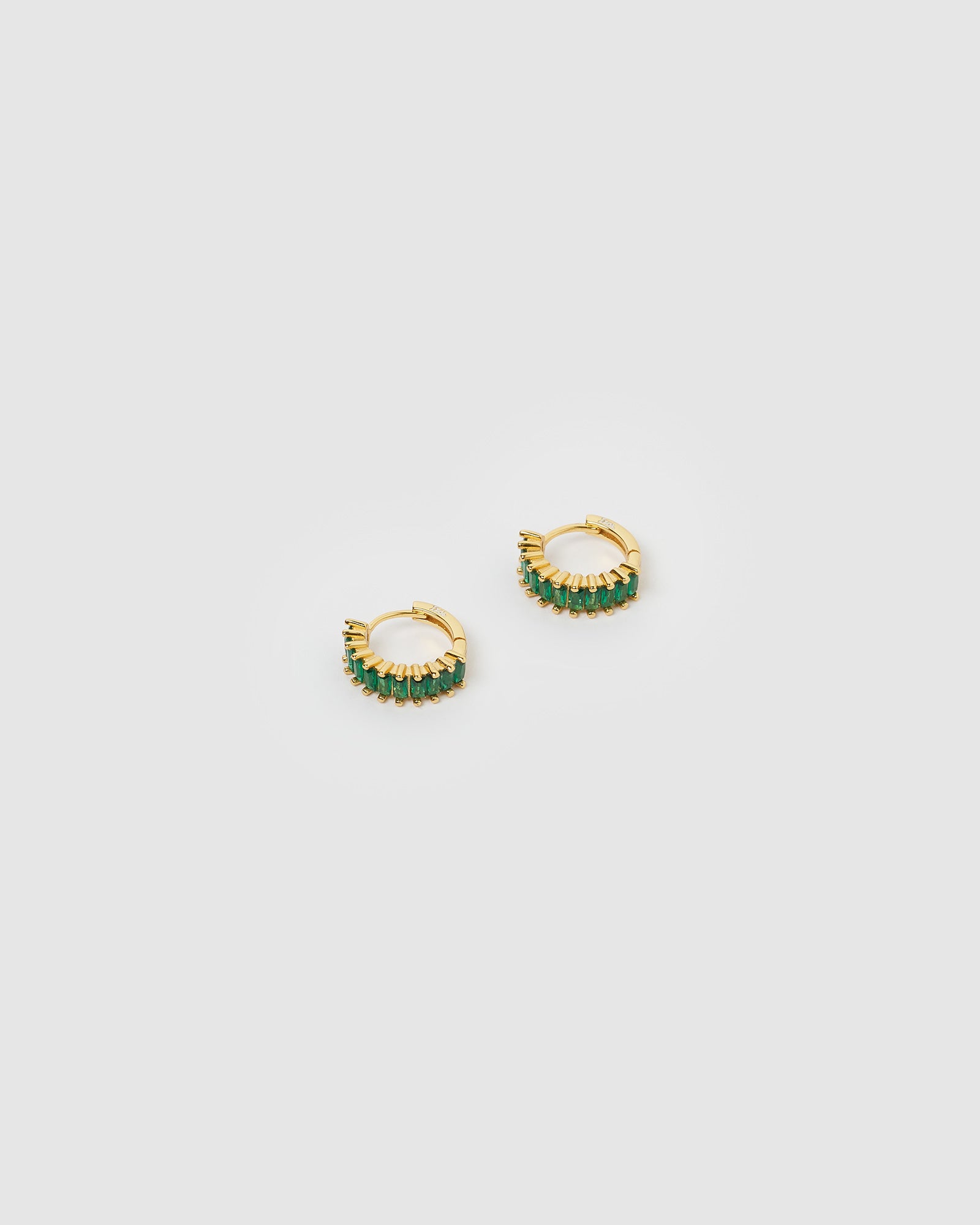 Shop huggie style earrings online at Izoa. Our Celine Huggie Earrings in Gold Green featuring cubic zirconias. These earrings can be worn everyday and paired with similar style huggies for a layered textural look. A simple way to sparkle up your look.