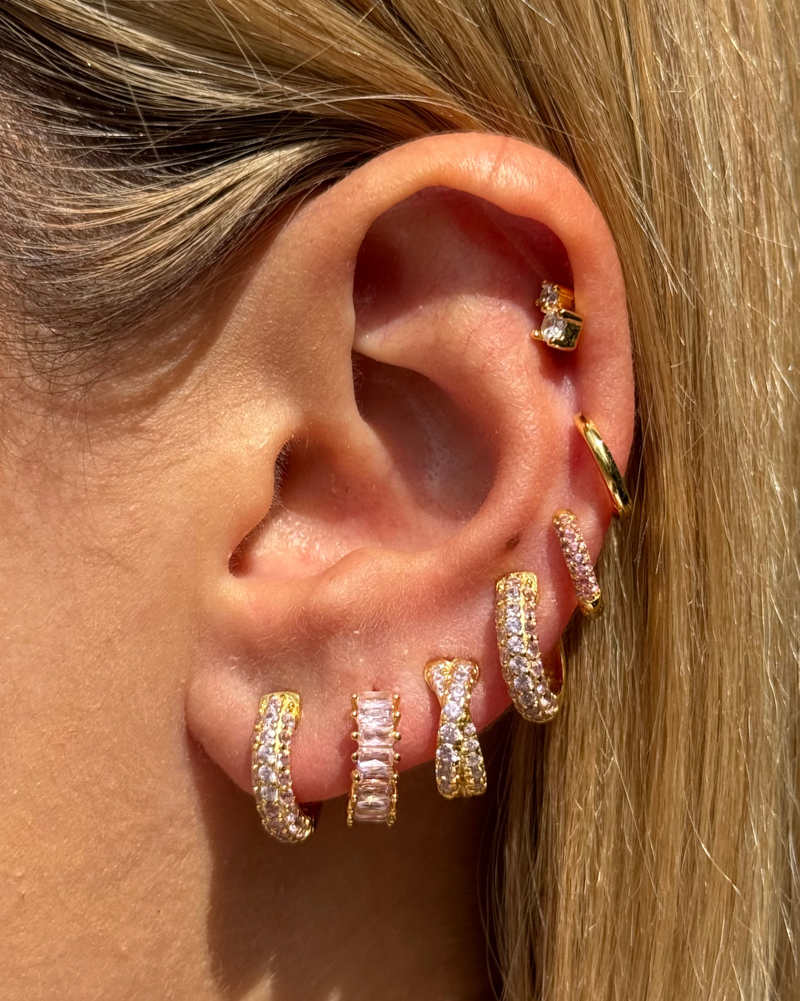 Simple and elegant are the Chelsea Mini Huggie Earrings in Gold baby Pink. Sparkling clear cubic zirconia half set in these petite sterling silver 18k gold plated hoops are designed to hug your ear. Perfect piece for layering or own its own.