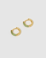 Simple and elegant are the Coco Huggie Earrings in Green . Sparkling green cubic zirconia half set in these petite stainless steel 18k gold plated hoops are designed to hug your ear. Perfect piece for layering or own its own.