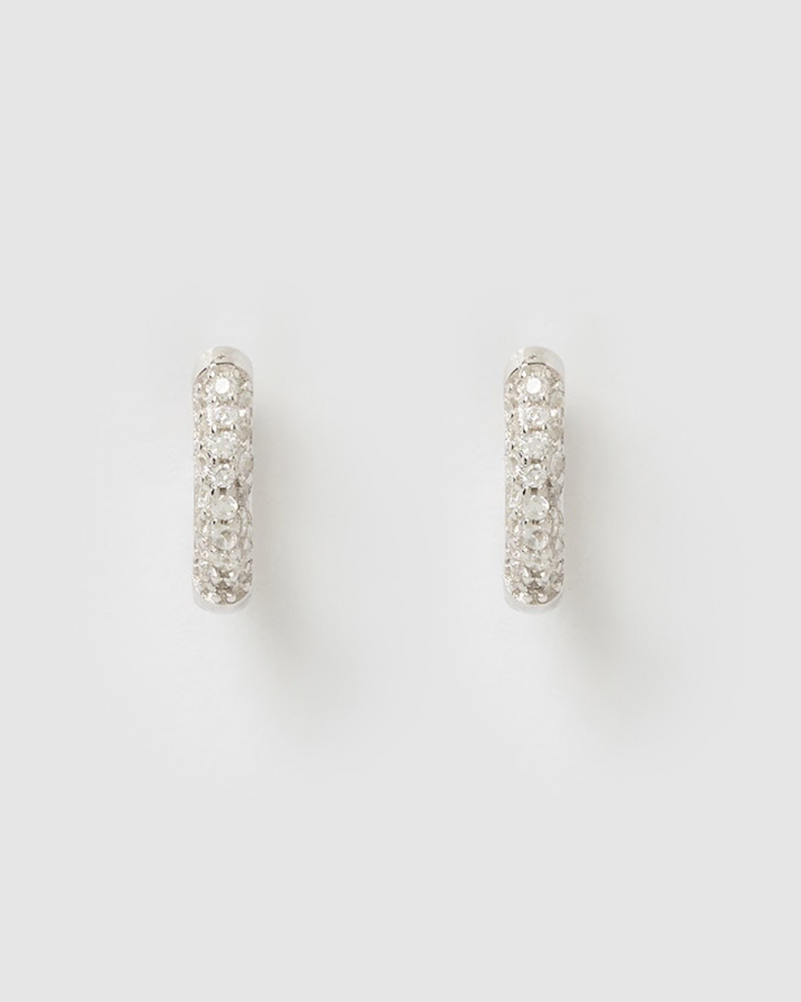 Simple and elegant are the Coco Huggie Earrings in Silver . Sparkling silver cubic zirconia half set in these petite stainless steel 18k gold plated hoops are designed to hug your ear. Perfect piece for layering or own its own.