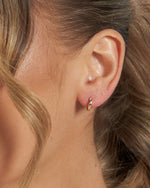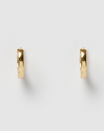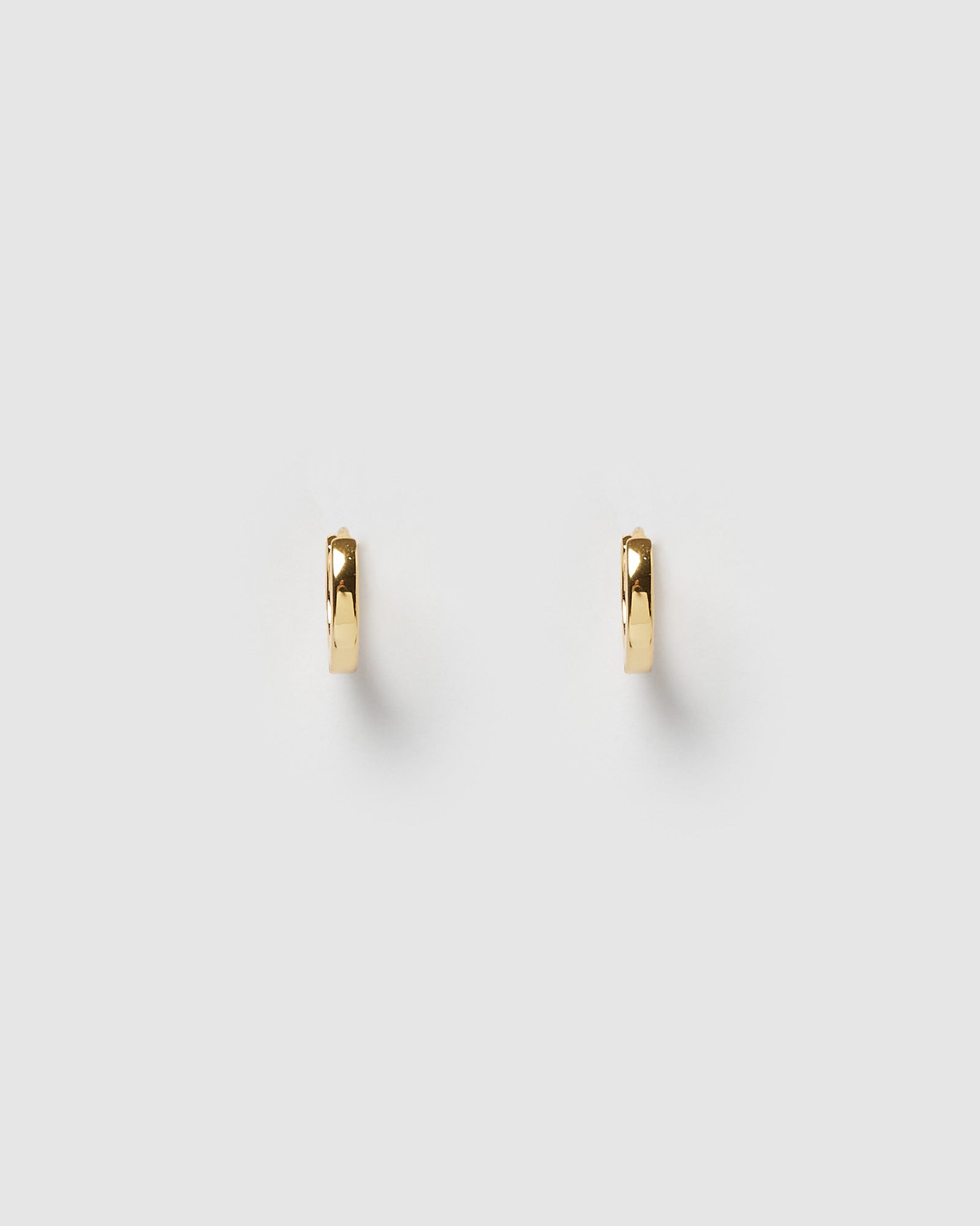 Shop huggie style earrings online at Izoa. Our Solid Huggie Earrings in Gold are petite style fit. These smooth finished earrings can be worn everyday and paired with similar style huggies for a layered textural look.