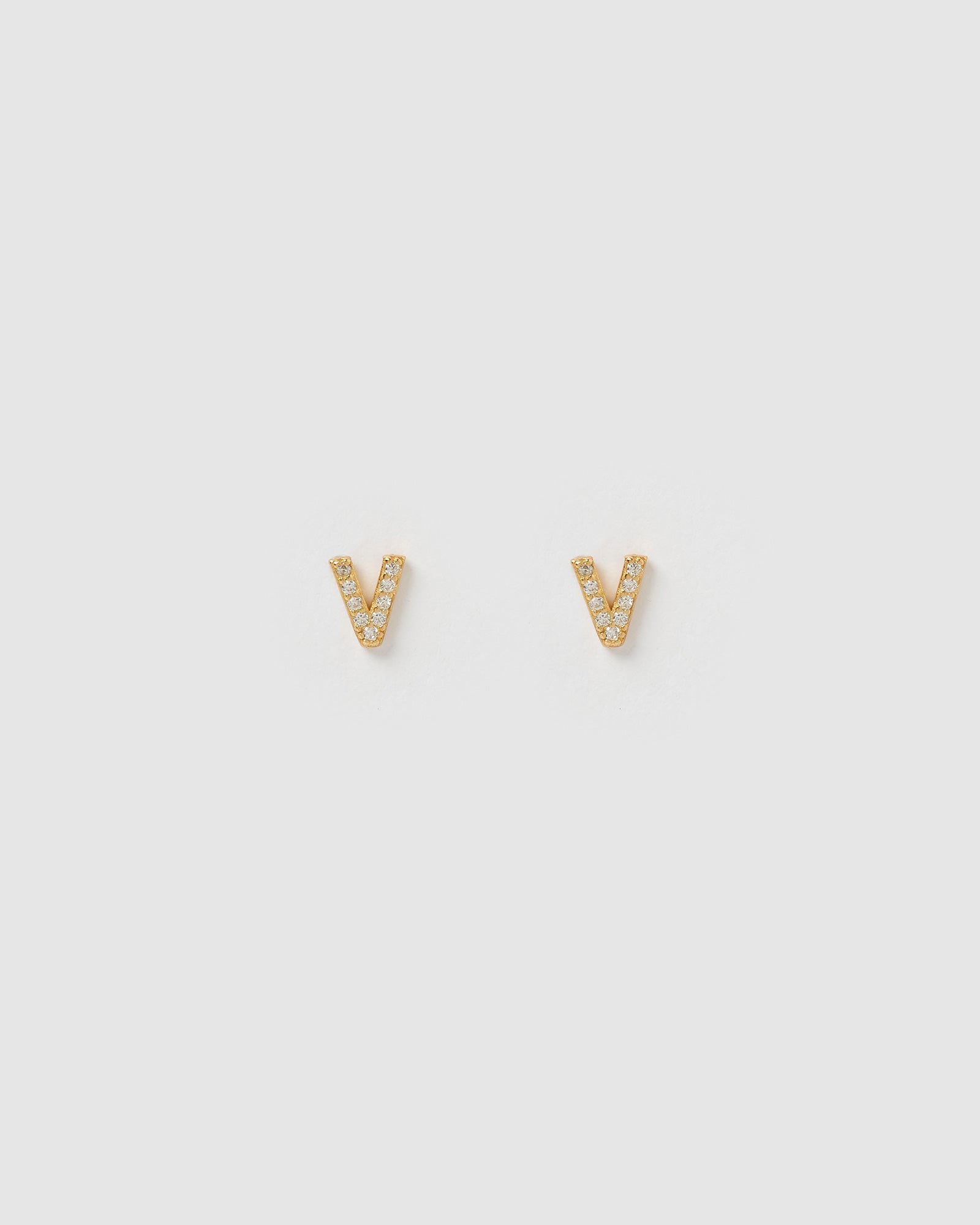 Personalise your look with our Alphabet Letter V Stud Earrings in Gold. A chic minimalistic style embellished with cubic zirconias for that added sparkle. Personalise your look for any day or night outfit. These cute alphabet sparkly studs make the perfect gift. Available A-Z