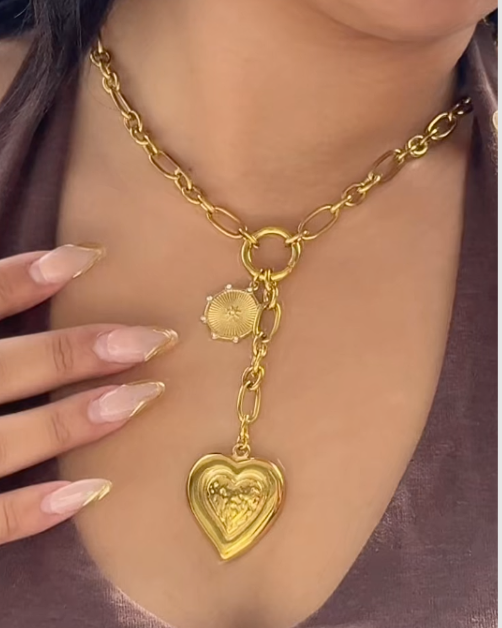 Make a statement with the Sophia Heart Pendant Necklace, featuring a chunky gold loop chain adorned with a bold heart pendant and a delicate star charm. Crafted for effortless layering or standout solo wear, this necklace is the perfect mix of trendy and timeless. Elevate any outfit with its modern yet romantic design, making it an essential addition to your jewellery collection.