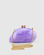 Elevate your evening style with the Eleanor Clutch in Lilac, a timeless accessory that exudes modern elegance. This hardcase clutch features a stunning lilac purple mother of pearl-inspired design crafted in an asymmetrical round silhouette, making it a standout piece for any special occasion.
