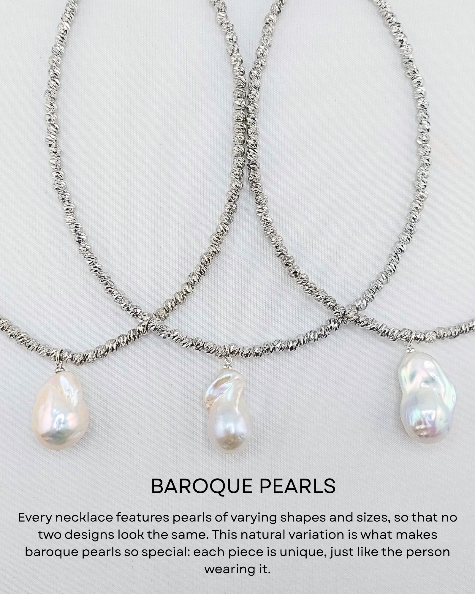 Classic and elegant our Odette Drop Pearl Necklace in Silver is a timeless piece to add to your jewellery collection. This simple drop pearl necklace exudes style with small dainty textured ball chain, rhodium plated and a refined slide lock clasp. This necklace features a naturally formed baroque pearl — celebrated for its organic shape, lustrous finish, and one-of-a-kind beauty. No two pearls are ever the same, making every piece truly unique. Timeless yet modern, this freshwater pearl necklace adds an effortless touch of elegance to any look. Wear it dressed down for day with a simple black dress or wear it at night for an elusive touch of sparkle at dinner parties, birthdays, cocktail events or any special occasion you need to dress up for. It would also be the perfect bridal jewel!