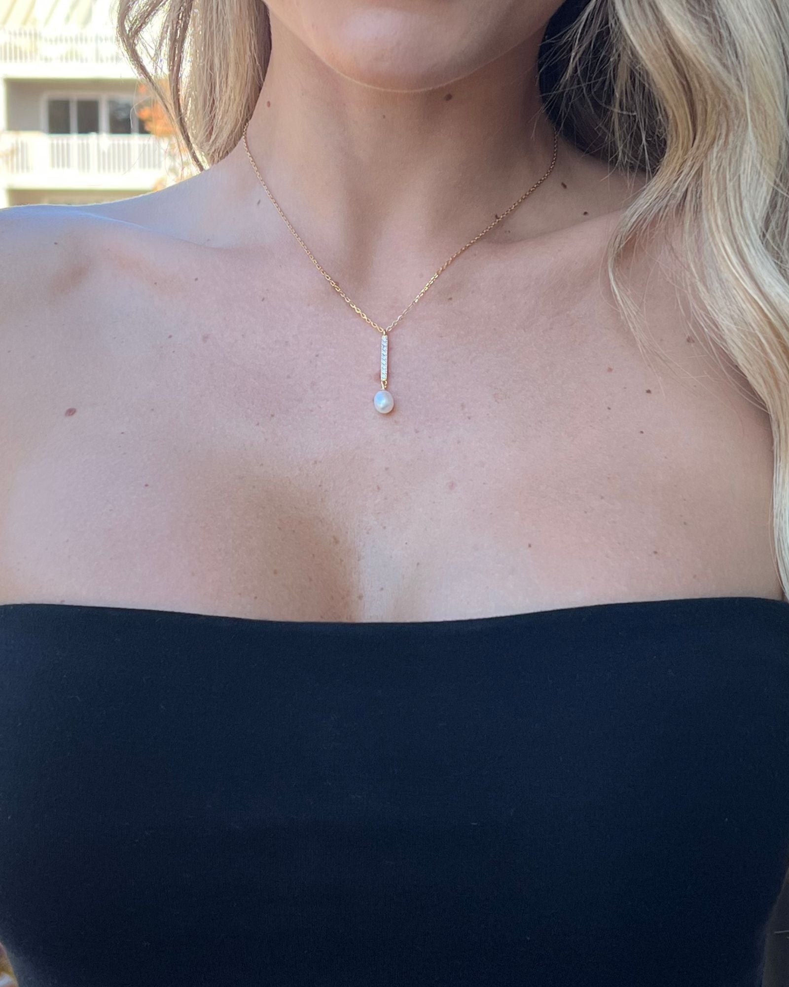 Take a chance on our sterling silver 18k gold plated necklace. Our Angie Necklace in gold pearl is definitely the one accessory you need. Simple and dainty this style can be layered with simple pieces or worn on its own. Featuring a pearl charms, this necklace will last forever!