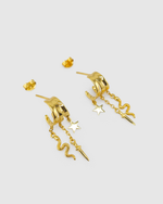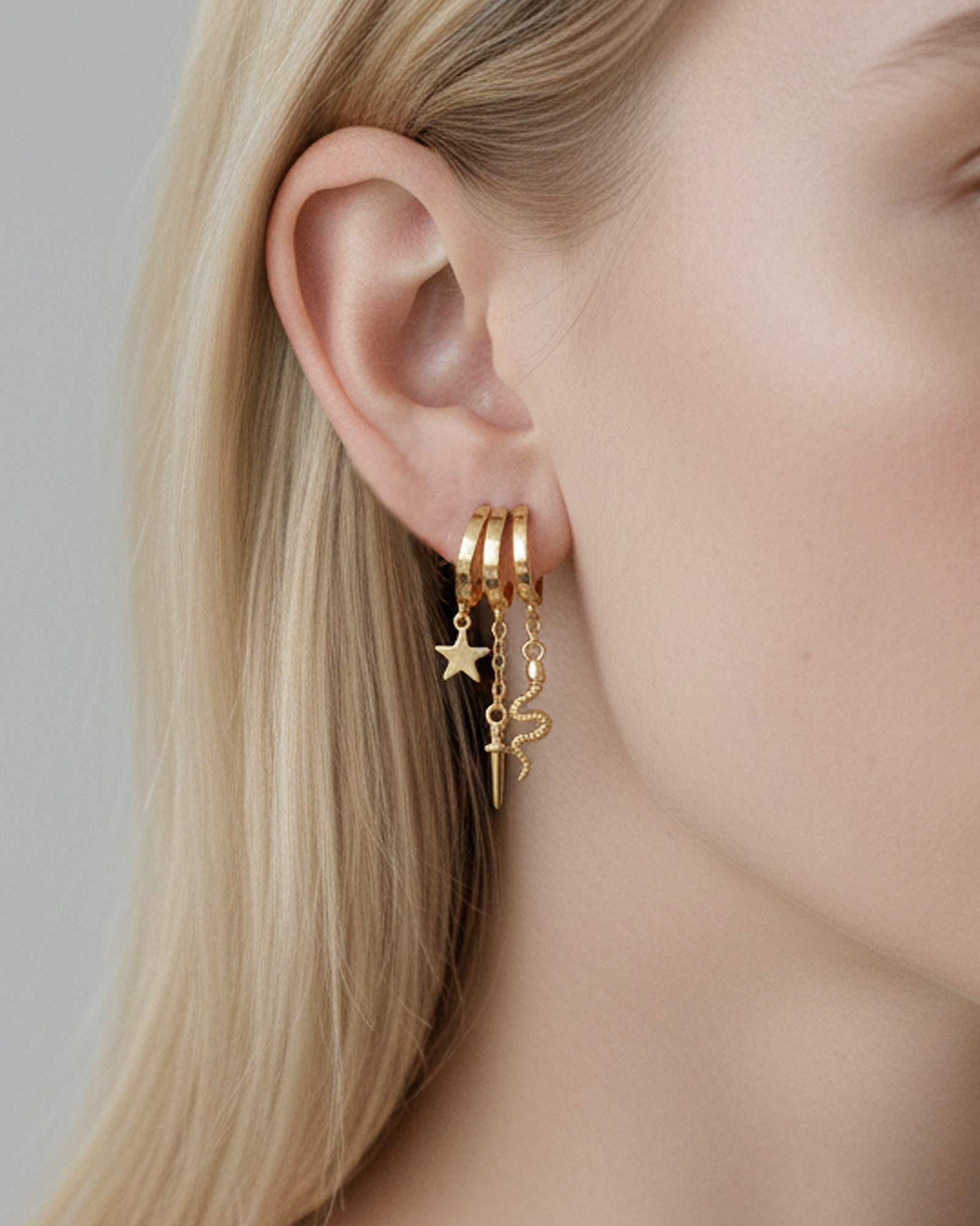 Unit price / perCreate the ultimate stacked look — without multiple piercings — with the Snake Trio Huggie Earrings. These illusion earrings feature three hoops in one stud, giving the effect of a full ear stack with just a single piercing. 18k gold plating charms of a snake, sword and star hang from the hoops . Lightweight and statement-worthy, these 3-in-1 huggies are perfect for adding dimension and drama to your everyday style. No hassle, just high-impact shine.