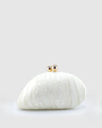 Elevate your evening style with the Eleanor Clutch in White, a timeless accessory that exudes modern elegance. This hardcase clutch features a stunning mother of pearl-inspired design crafted in an asymmetrical round silhouette, making it a standout piece for any special occasion.