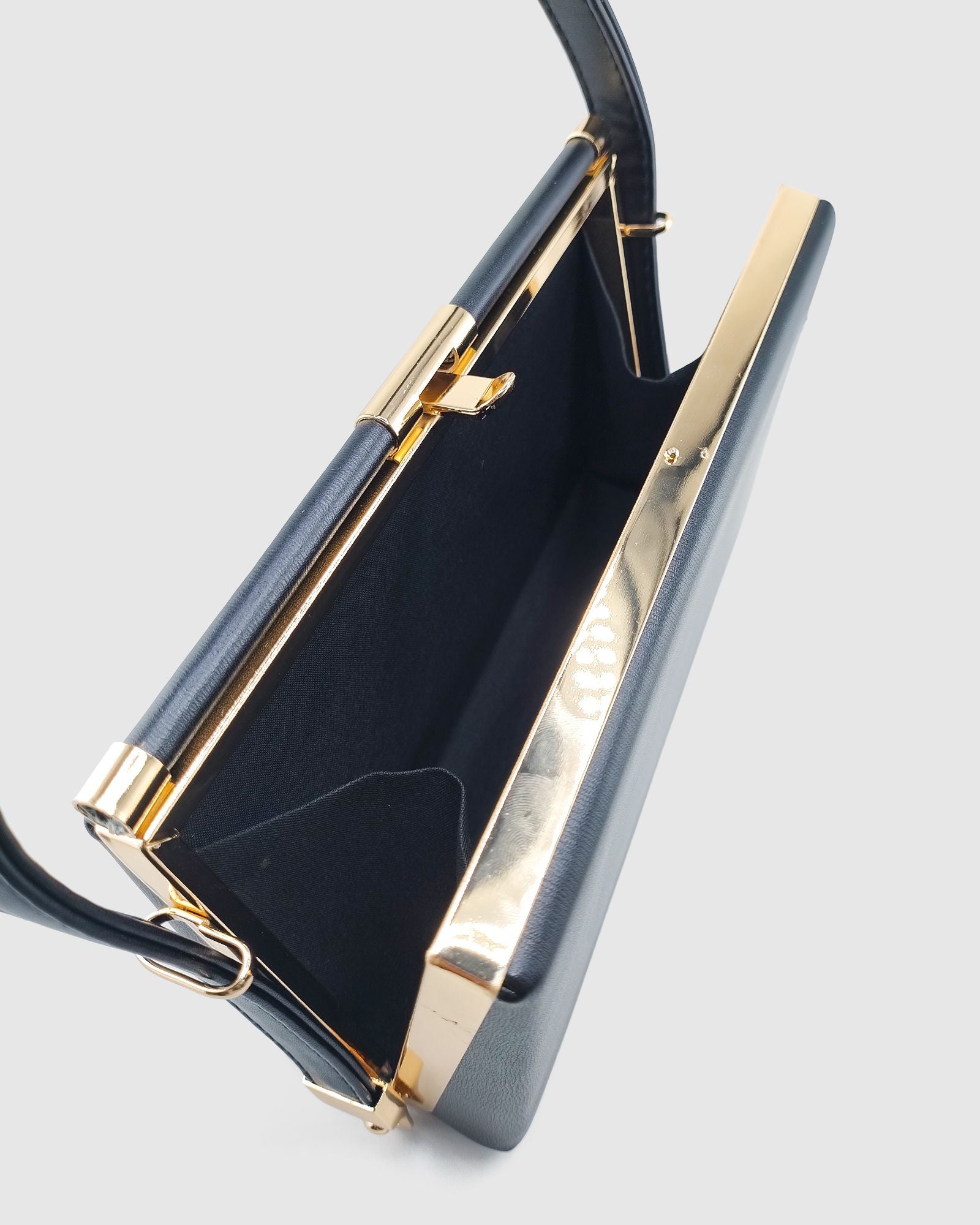 Chic, timeless, and endlessly versatile — the Mikki Clutch in Black is your go-to accessory for any special occasion. Crafted from high-quality premium PU pleated leather, offering the luxurious look and feel of genuine leather with added durability and ease of care. The smooth, refined finish gives each piece a polished look, while the supple texture ensures a soft, comfortable carry. This sleek clutch is framed with a luxe gold hard case for a structured silhouette. The clasp closure at the top adds a vintage-inspired touch, paired with a sleek black handle for the perfect shoulder bag. Also features a long gold chain strap allows for easy crossbody wear. Compact yet roomy enough to fit your iPhone and essentials, it’s perfect for weddings, evenings out, or elevated everyday styling.
