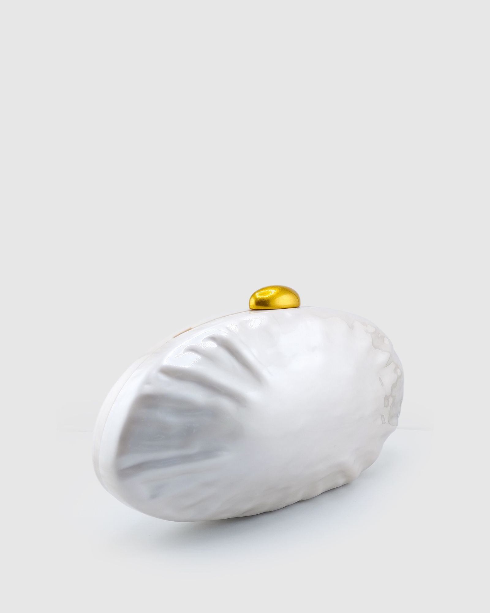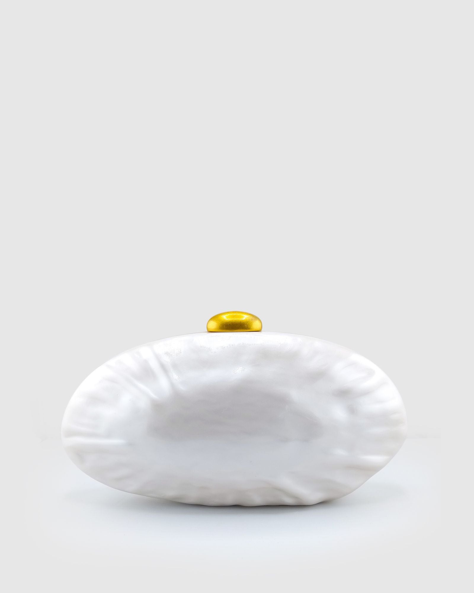 Elevate your evening style with the Sierra Clutch in White, a timeless accessory that exudes modern elegance. This hardcase clutch features a stunning white pearl-inspired design crafted in an round silhouette, making it a standout piece for any special occasion.