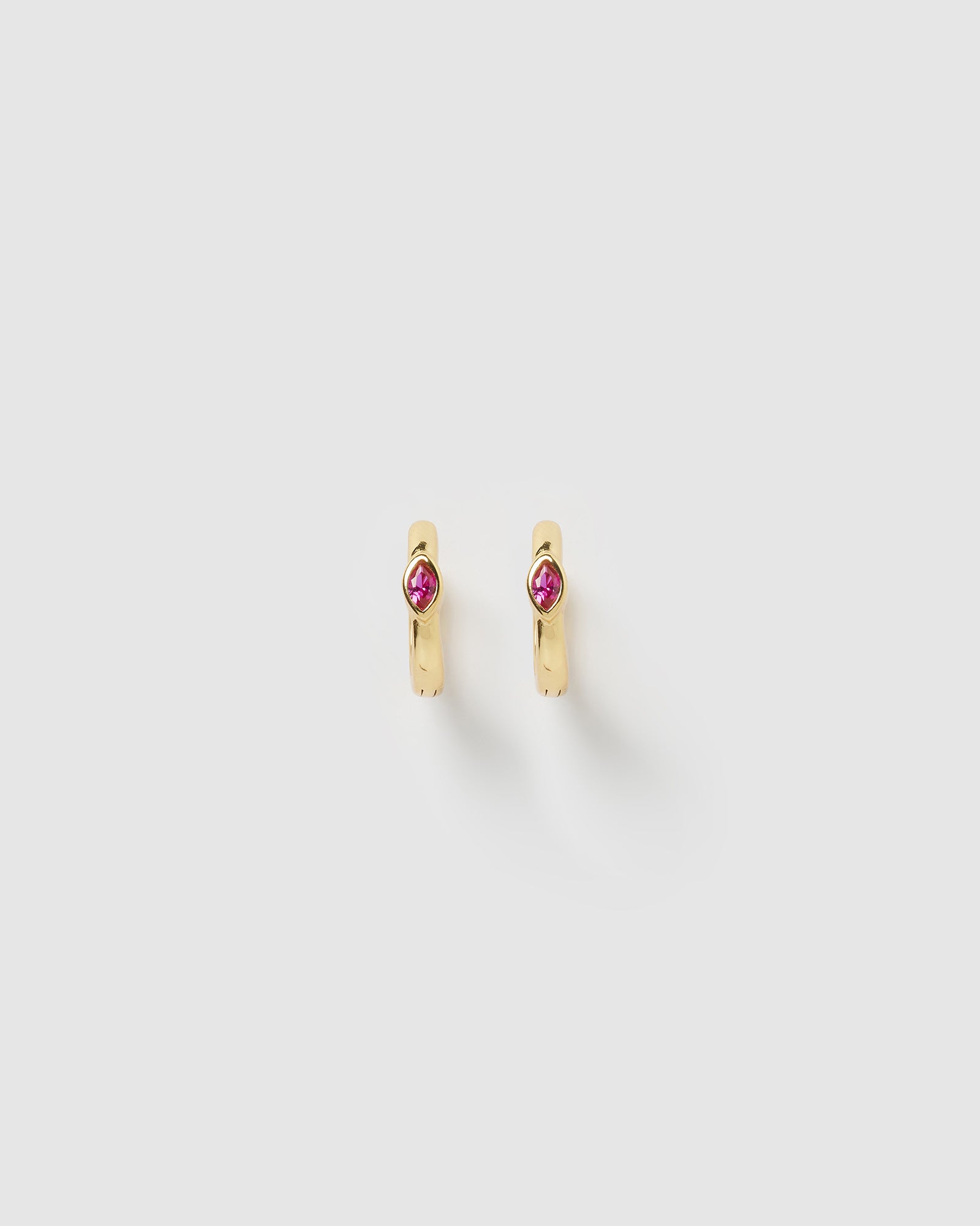 Shop huggie style earrings online at Izoa. Our Capri Huggie Earrings in Gold Pink are petite style fit. These smooth finished earrings featuring a single cubic zirconia at the front can be worn everyday and paired with similar style huggies for a layered textural look.