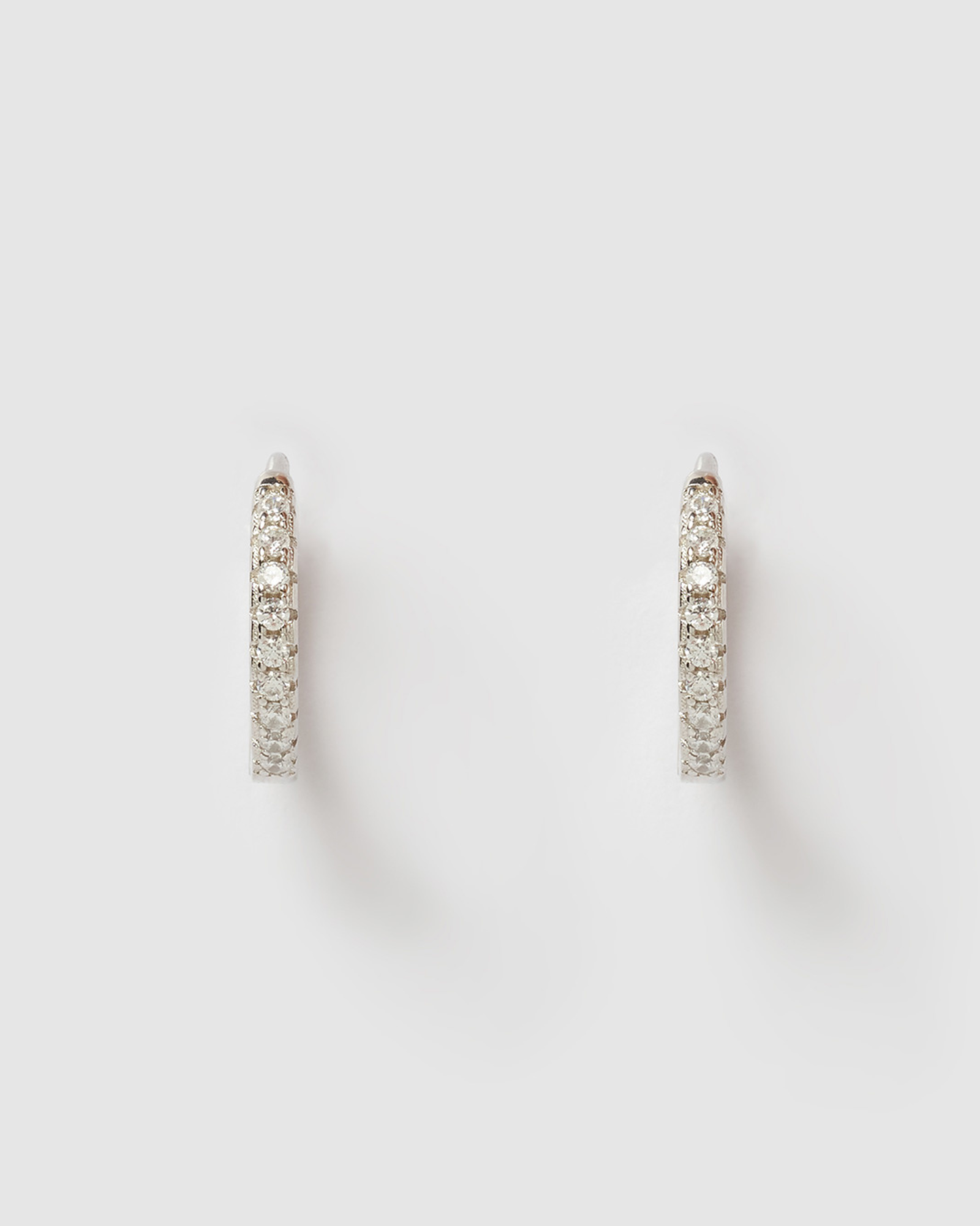 Simple and elegant are the Rae Small Huggie Earrings in Silver. Sparkling clear cubic zirconia half set in these petite sterling silver hoops are designed to hug your ear. Perfect piece for layering or own its own.