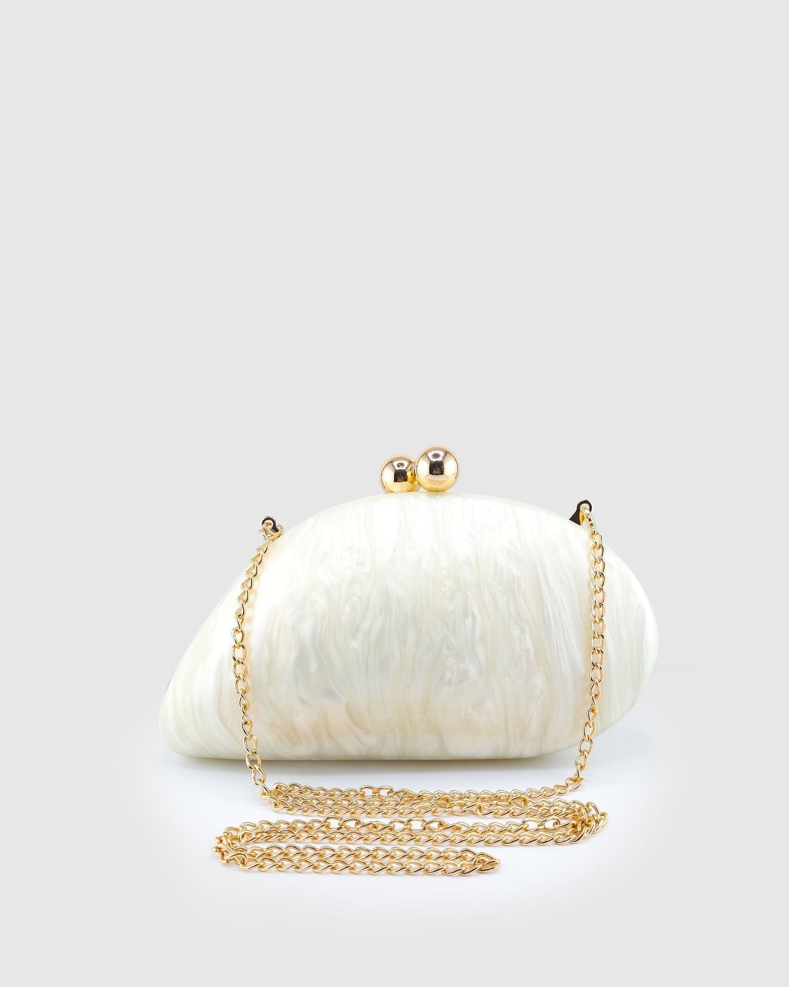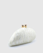 Elevate your evening style with the Eleanor Clutch in White, a timeless accessory that exudes modern elegance. This hardcase clutch features a stunning mother of pearl-inspired design crafted in an asymmetrical round silhouette, making it a standout piece for any special occasion.