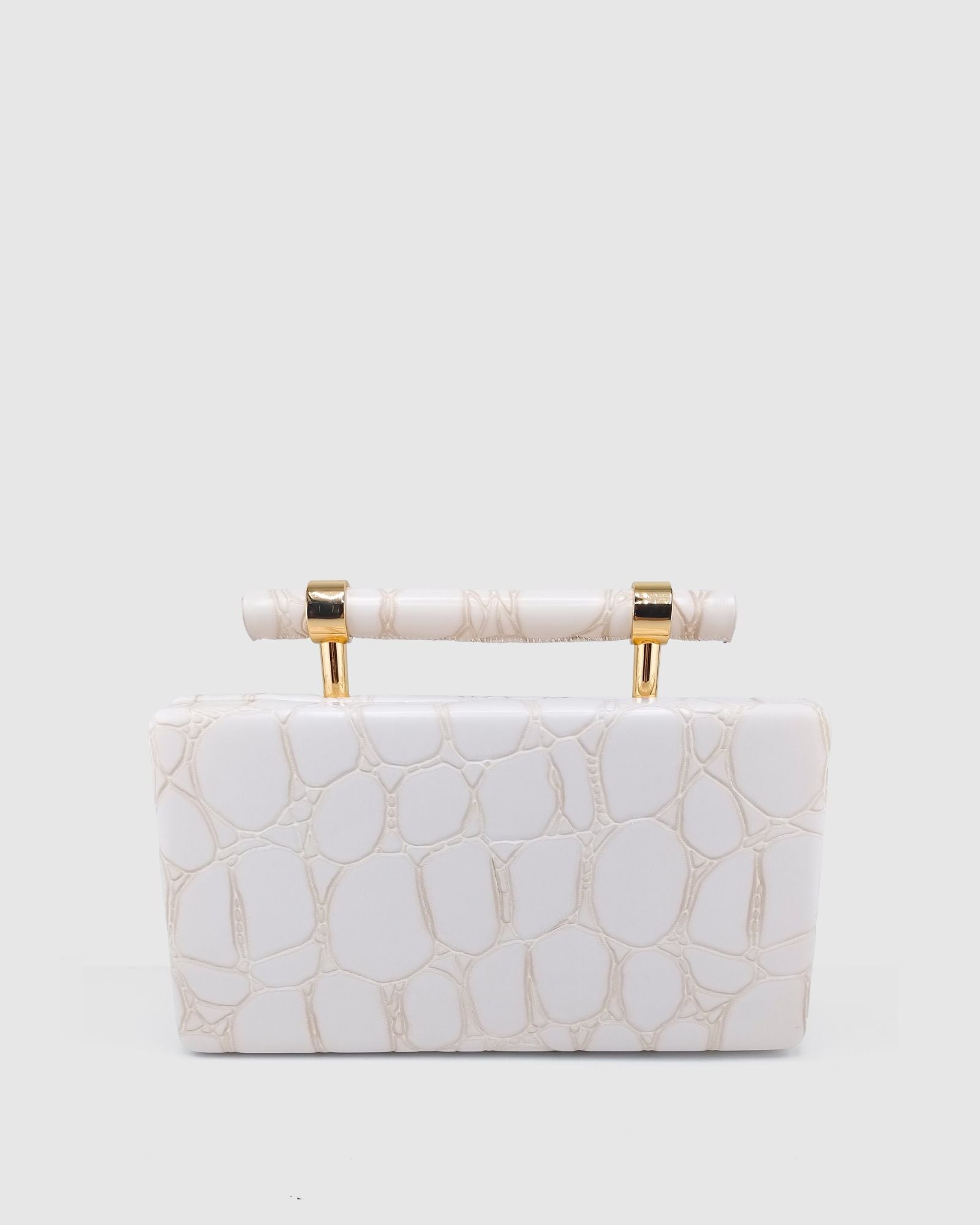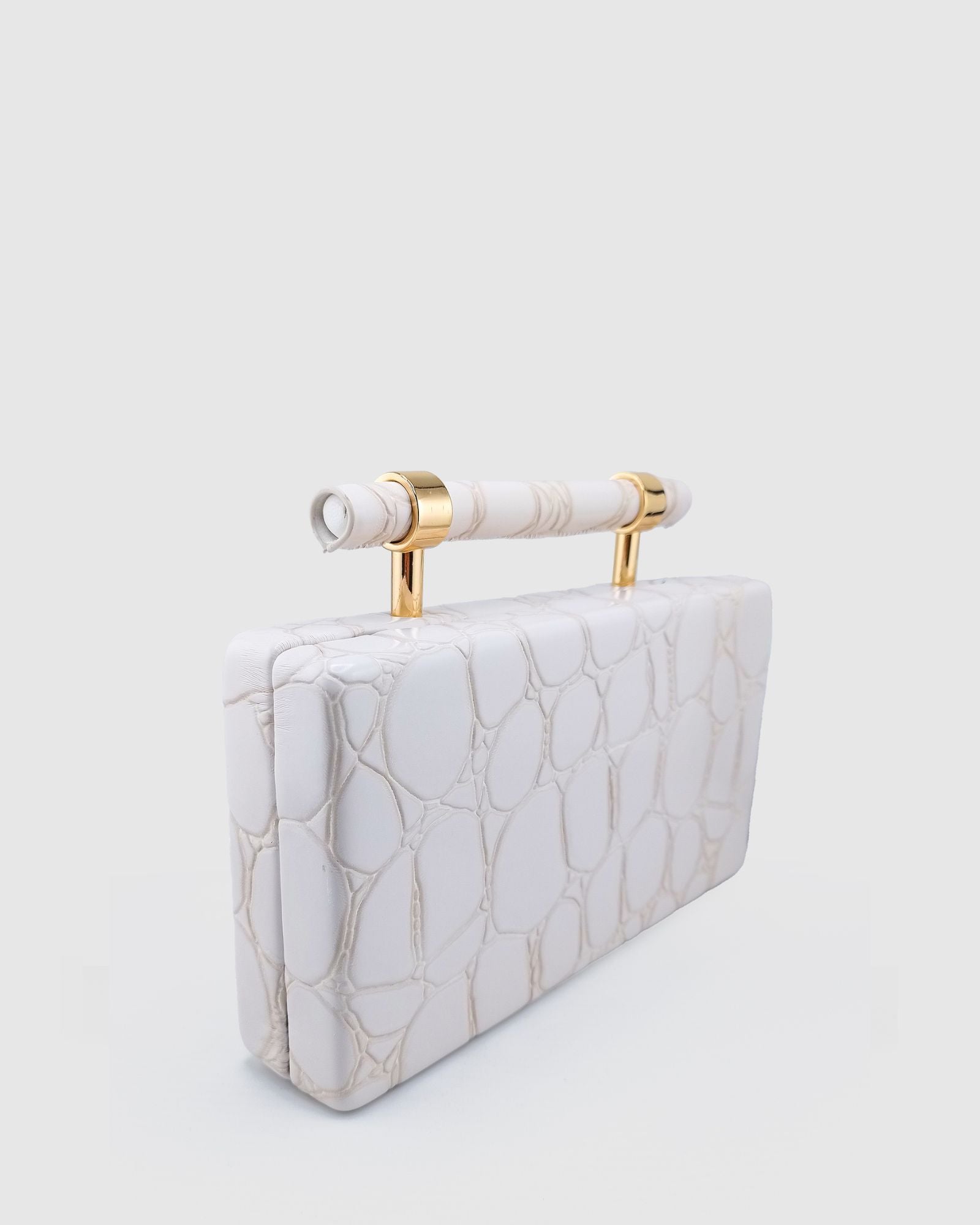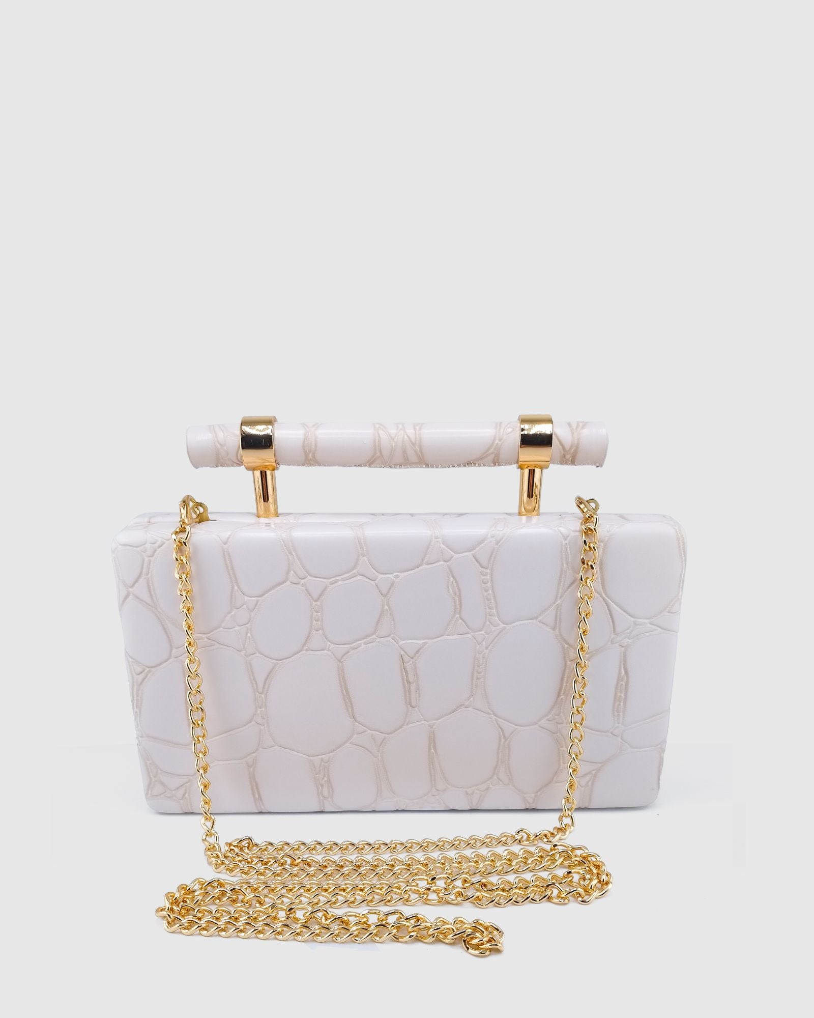 Sophisticated and timeless, the Coco Clutch in White is crafted from premium cow PU leather with a sleek rectangular silhouette. Designed for elegance and versatility, it features a structured top handle finished with polished gold hardware, making it a chic statement piece for both day and night.