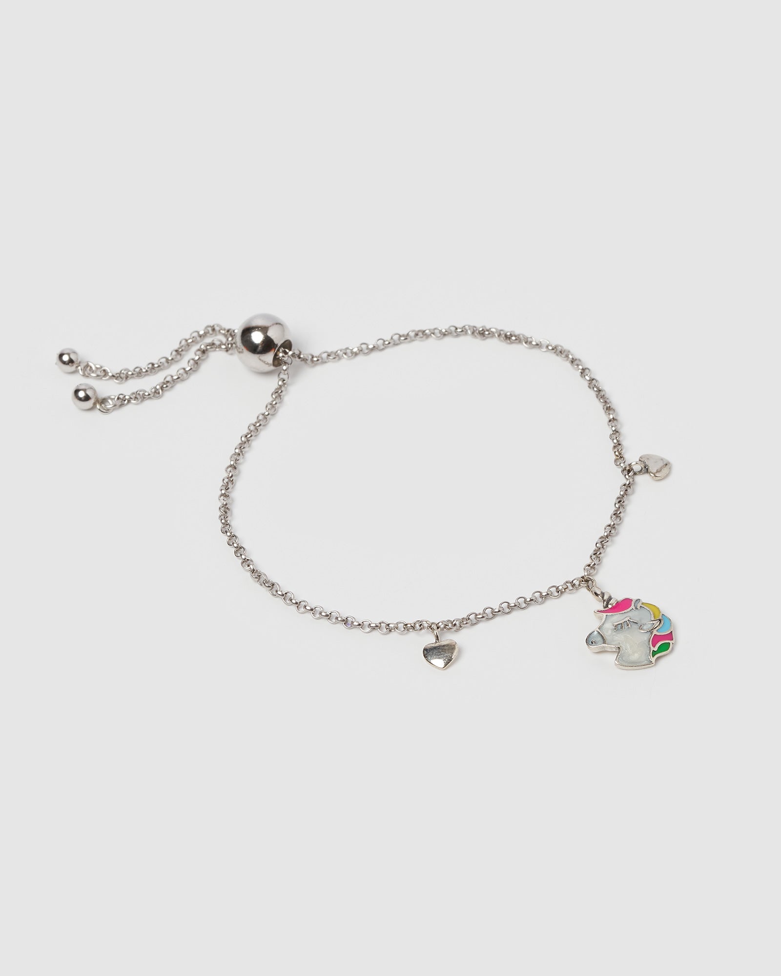 Shop our Izoa Kids Unicorn Bracelet in Sterling Silver. This sterling silver adjustable chain length bracelet will keep your young one stylish. Unicorn motif with painted coloured enamel can be worn with similar bracelets or on its own.