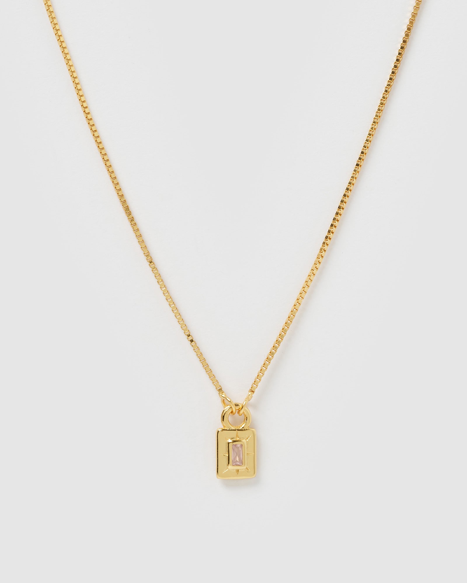 Our Cairo Pendant Necklace in Gold featuring a drop charm with an pink stone. This sterling silver 18k gold plated necklace is perfect for layering or stylish and simplistic on its own. Pair with our Cairo Huggies.