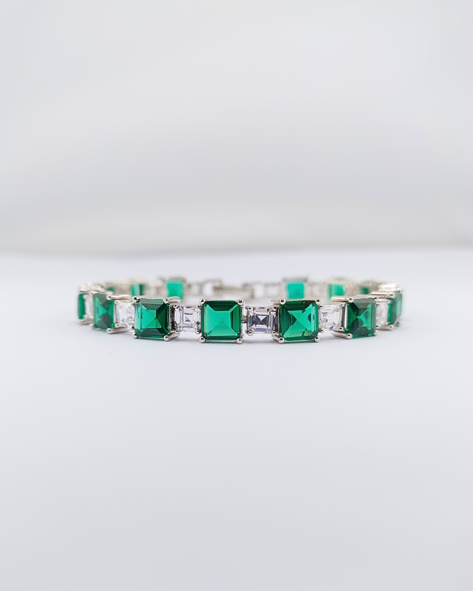 Elevate your wrist game with the elegant sparkle of the Catherine Tennis Bracelet in Sterling Silver and Green. Crafted from premium sterling silver, this stunning bracelet features a delicate row of green and clear square crystals, designed to catch the light with every movement and add a graceful, shimmering touch to any outfit.