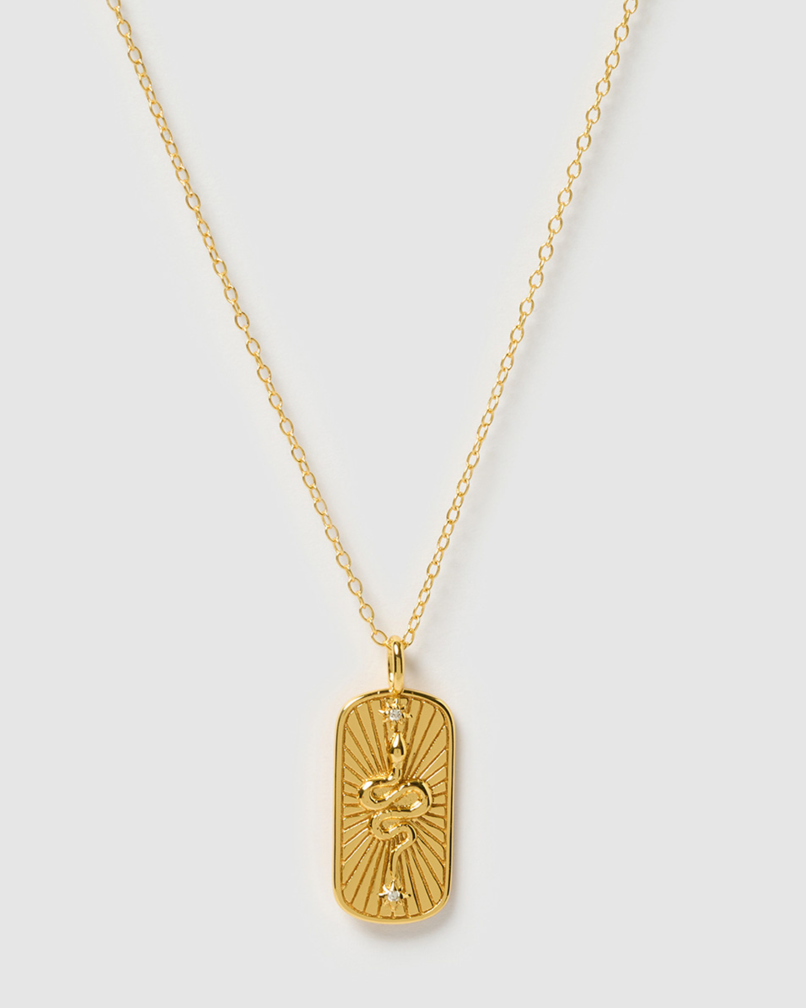 Shop the Izoa Alma Pendant Necklace in Gold. This sterling silver 18k gold pendant necklace is embossed with a snake design featuring cubic zirconia embellishments. A great layering piece or ideal to keep it simple and dainty.