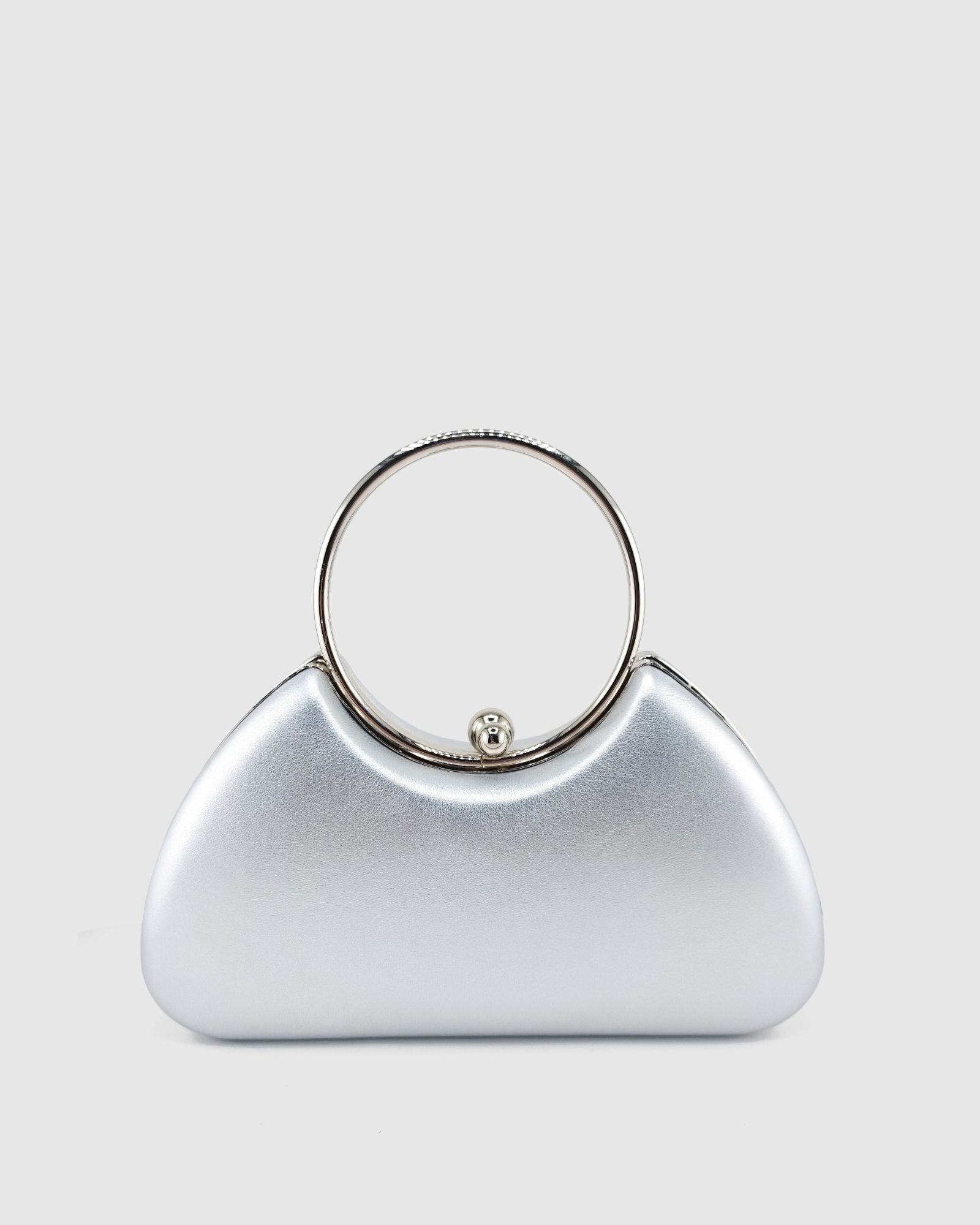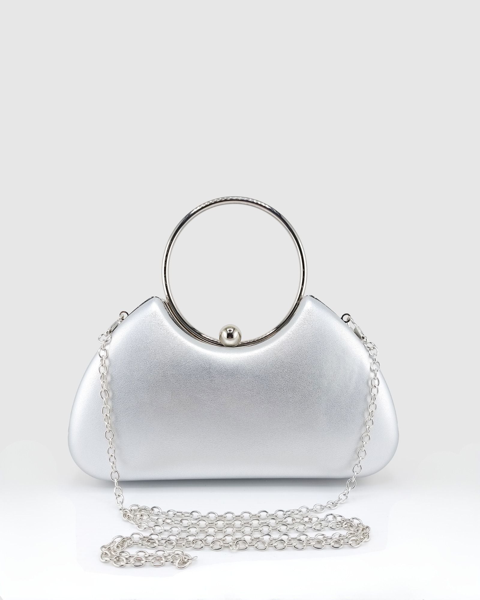 Elevate your style with the Skye Clutch, a statement accessory crafted from luxurious silver PU leather. Designed with a unique curved silhouette, this clutch brings modern elegance to any outfit. Featuring a circular handle, sleek silver hardware, and a chic double ball fastening, it’s the perfect balance of glamour and functionality.