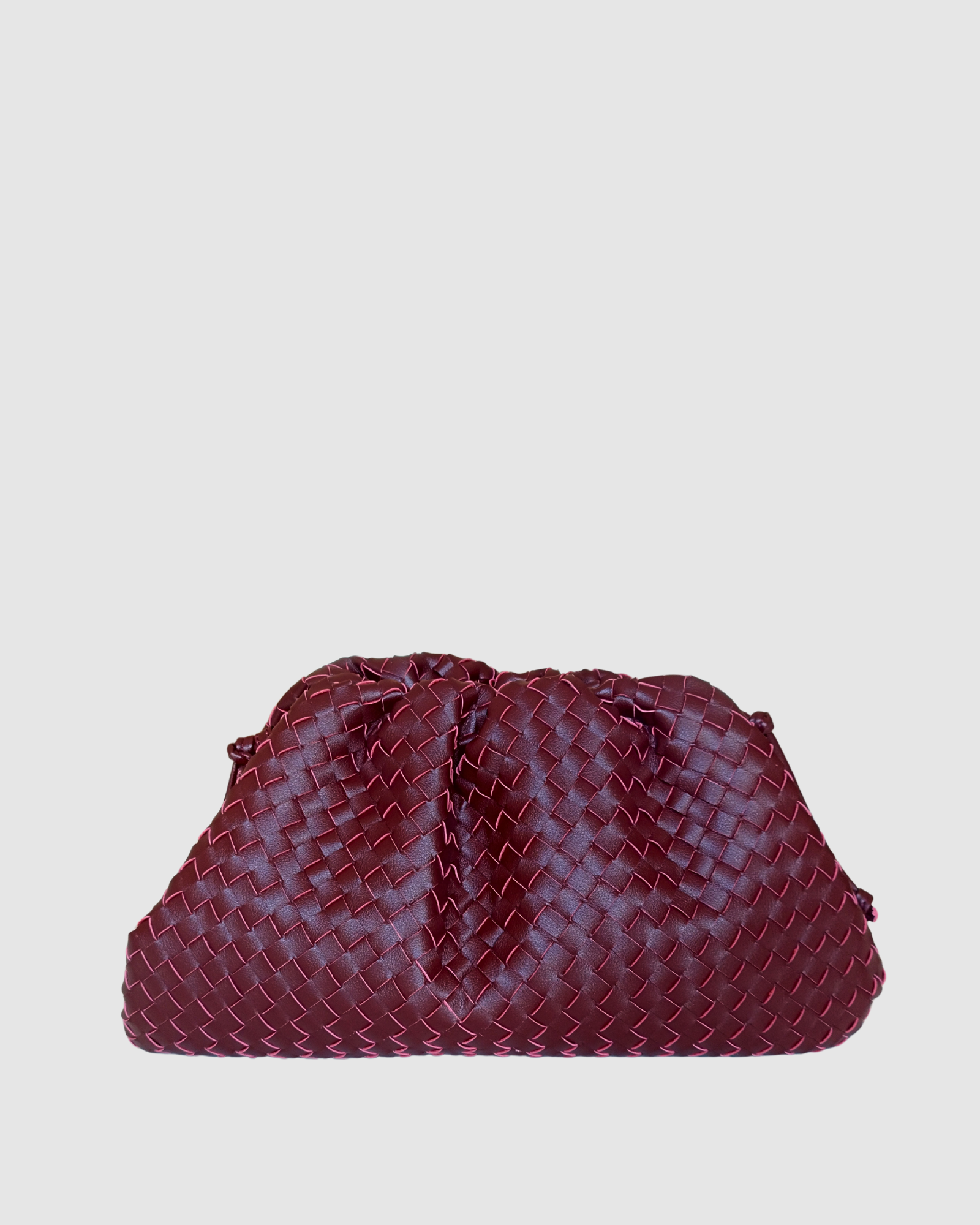 The Izoa Vincenza Woven Bag in Burgundy combines sophisticated style with practical functionality. This versatile leather handbag showcases an intricate woven construction that adds texture and visual interest to any outfit.