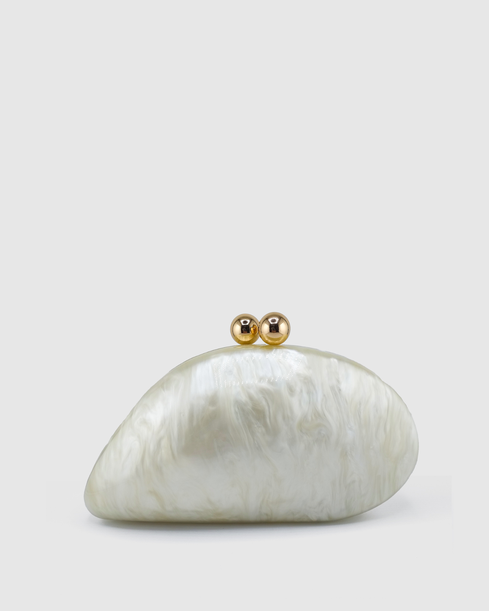 Elevate your evening style with the Eleanor Clutch in Cream, a timeless accessory that exudes modern elegance. This hardcase clutch features a stunning cream ivory mother of pearl-inspired design crafted in an asymmetrical round silhouette, making it a standout piece for any special occasion.