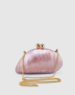 Elevate your evening style with the Eleanor Clutch in Pink, a timeless accessory that exudes modern elegance. This hardcase clutch features a stunning pink mother of pearl-inspired design crafted in an asymmetrical round silhouette, making it a standout piece for any special occasion.